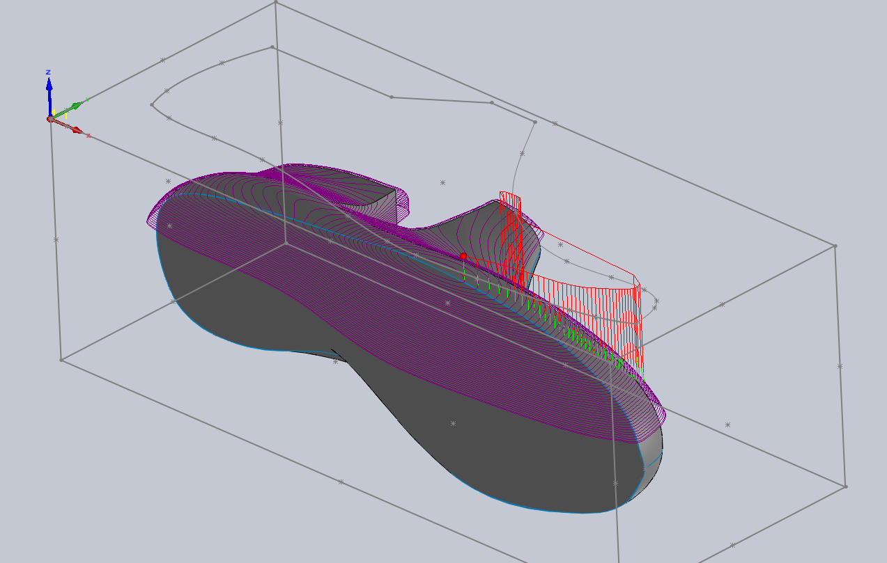 А так вообще то странное Вы выбрали размещение для этой детали. Почему нельзя обработать подошву, потом верх?
