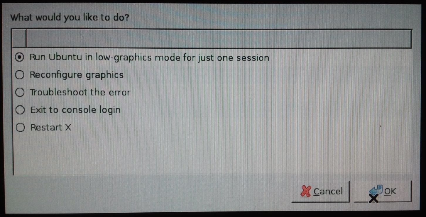 Попробуй выбрать "Reconfigure graphics". Если не поможет, то покажи содержимое /etc/X11/xorg.conf