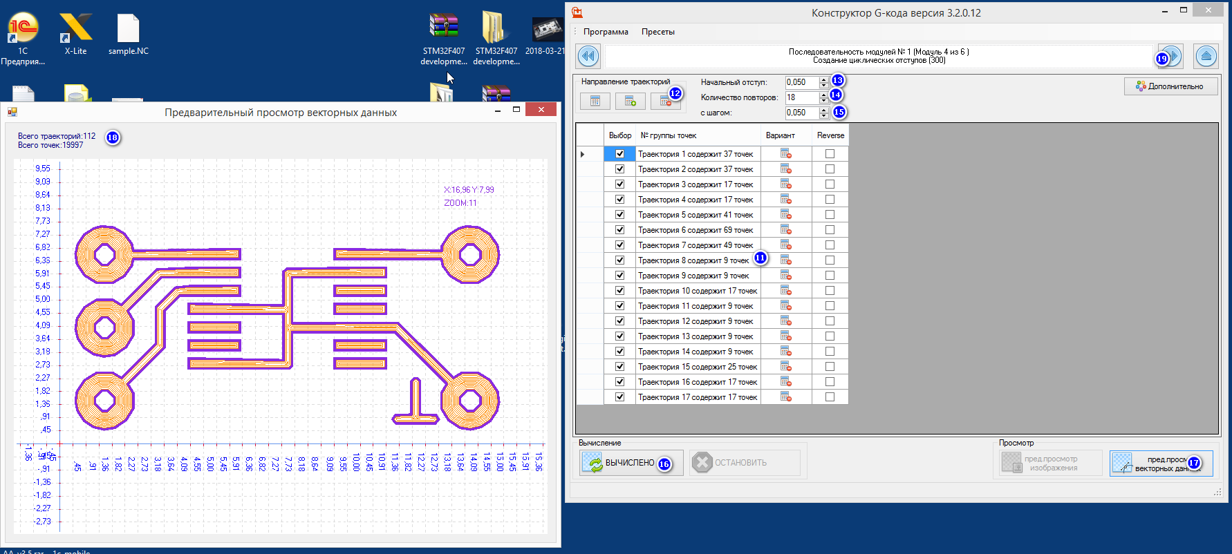 Пробовал разные варианты уже более "осознанно".selenur писал(а):Если выложишь рисунок, и расскажешь какой файл правил использовал в модуле 900, я могу подсказать как оптимизировать траекторию.SergK писал(а):Из-за повторов строк, гравировка платы размером 16х8 мм продолжалась 1.5 часа....