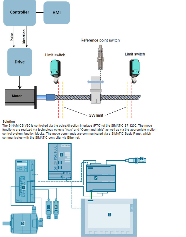 SINAMICS V: Controlled Positioning of a V90 with S7‑1200 via the Pulse/Direction Interface, with HMI (Set 7)