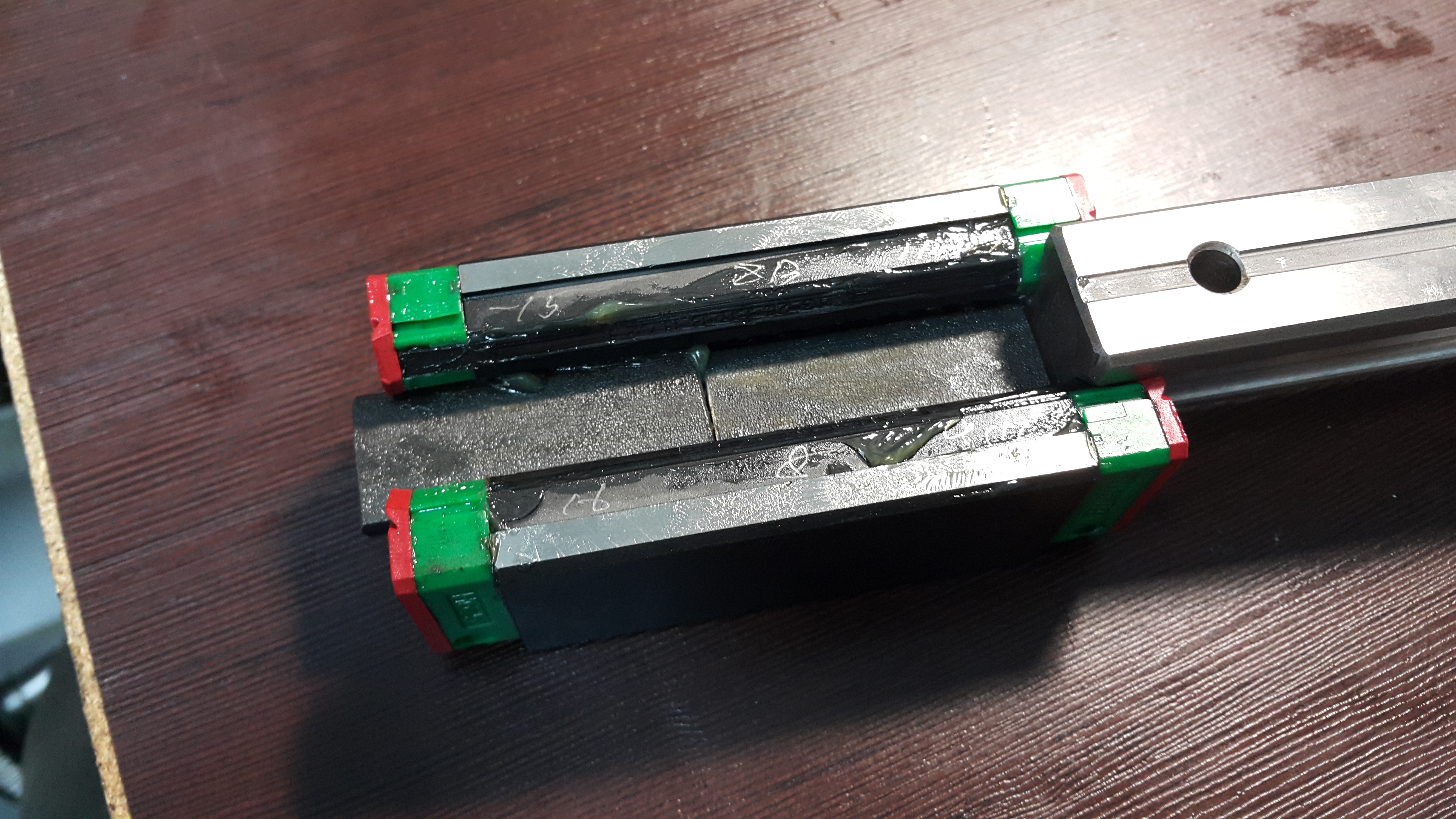 После мойки каретки конечно перестали греметь, но люфты то тоже никуда не ушли. 2 каретки на неизношенных частях рельс имеют преднатяг, плотненько так, 2 же катаются легко и свободно.