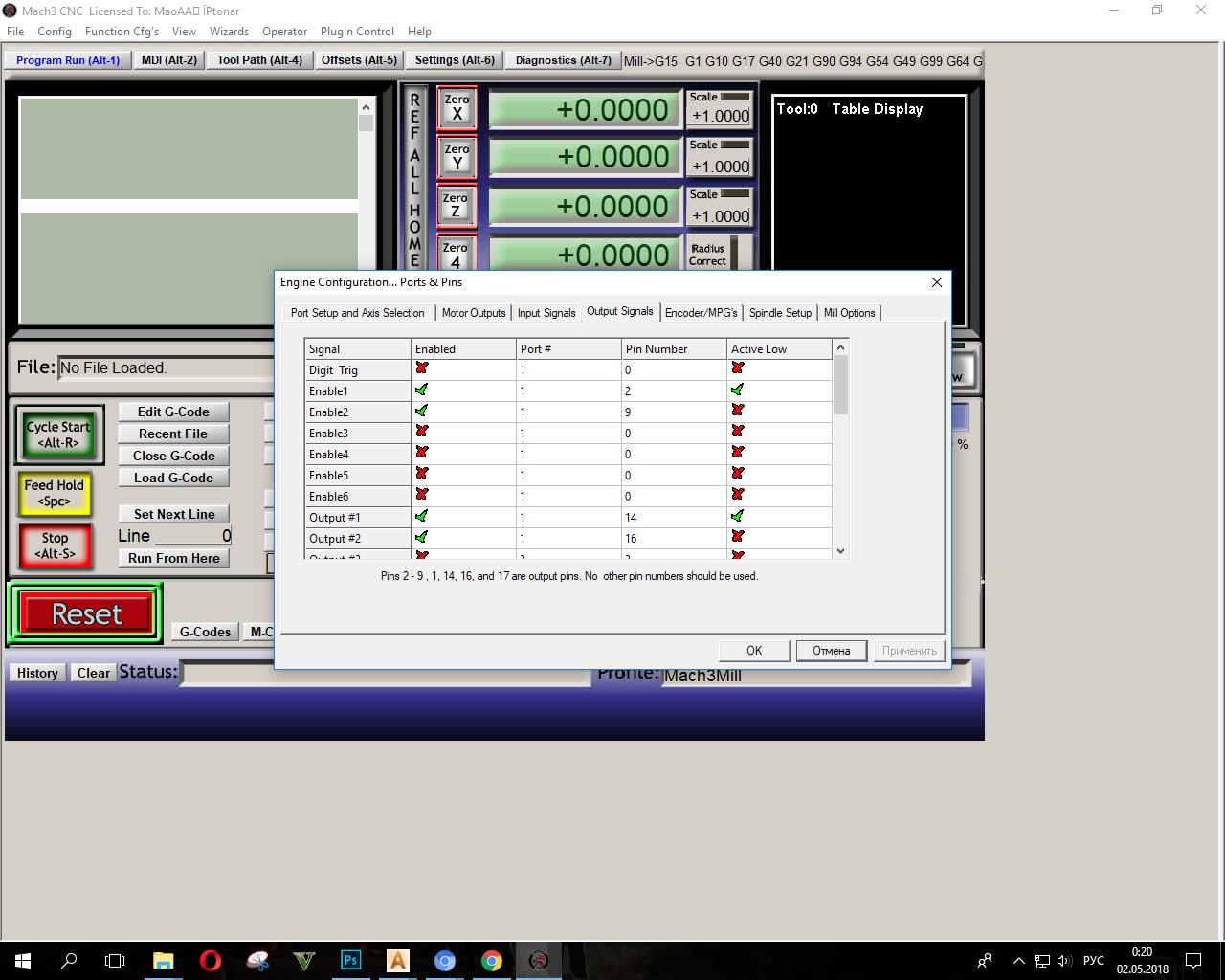 Кажется заработало. По крайней мере е-стоп точно определяется, нужно было указать порт#3 и реальный физический пин, хотя сам мач говорил что его нельзя использовать. Однако остается нерешенный вопрос с выходными сигналами, так же поставить 3 порт и физический пин не помогает. Вкладка диагностики так же не видит включенные выходы. И не совсем понятно какой сигнал должен поступать с этих пинов, земля или плюс?