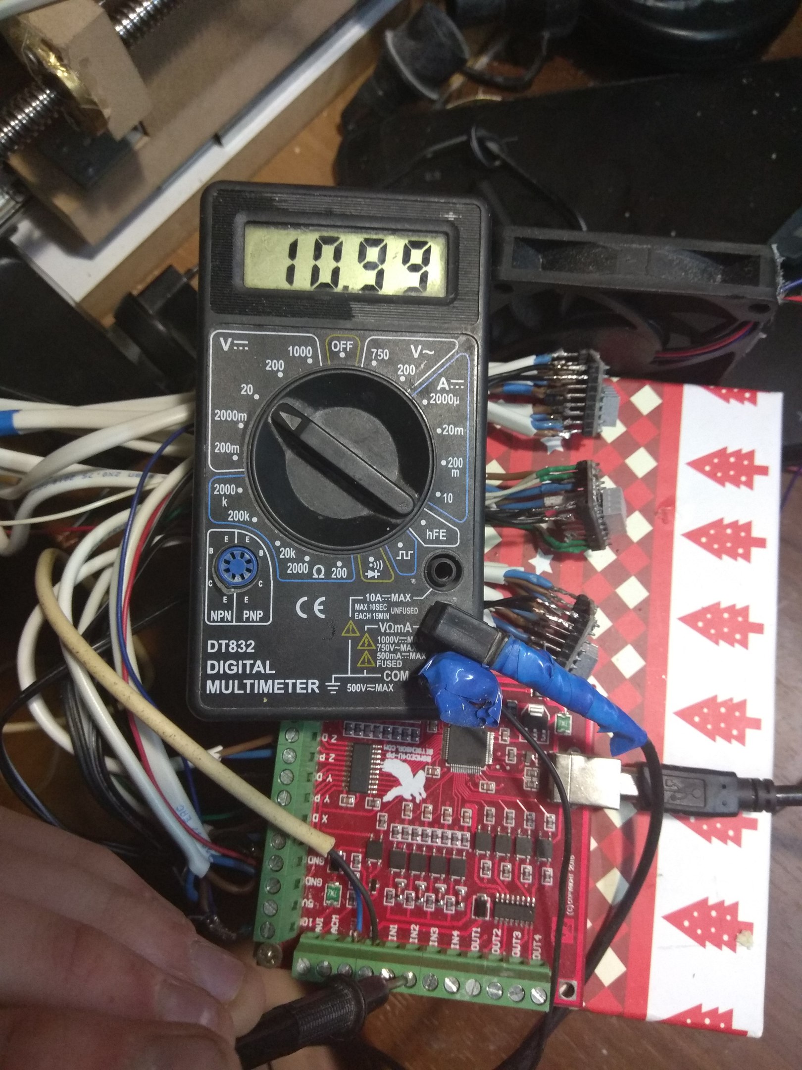 Проблема заключается в полном игнорировании мачем указанных портов, как входных так и выходных. Судя по пдф файлу для их корректной работы на плату нужно отдельно подводить напряжение, 12-24в. Тут кроется первый непонятный момент, пин подключения силового vcc подписан на плате, пин подключения его же gnd - нет.(пробовал подкидывать землю на пин DCM, это ничего не меняет.) Ладно, земля у платы есть и от юсб порта, подключаю только плюс(12в, питаю от компьютера к которому плата подключена), и сразу же на входных пинах появляется эти 12в. То есть если мерять мультиметром поставив один щуп на землю платы и контакты подписанные как in, на них около 12в. От настроек мача это никак не зависит, они появляются при подключении питания даже без запуска софта. То есть, мне уже непонятно какой входящий сигнал на них должен приходить. Куда в этой схеме нужно подключать концевики? Скрин настроек на всякий случай прилагаю. Еще один момент, я включал эмуляцию кнопки экстренной остановки и простых концевиков клавишами клавиатуры, сам мач никак на них не реагирует.