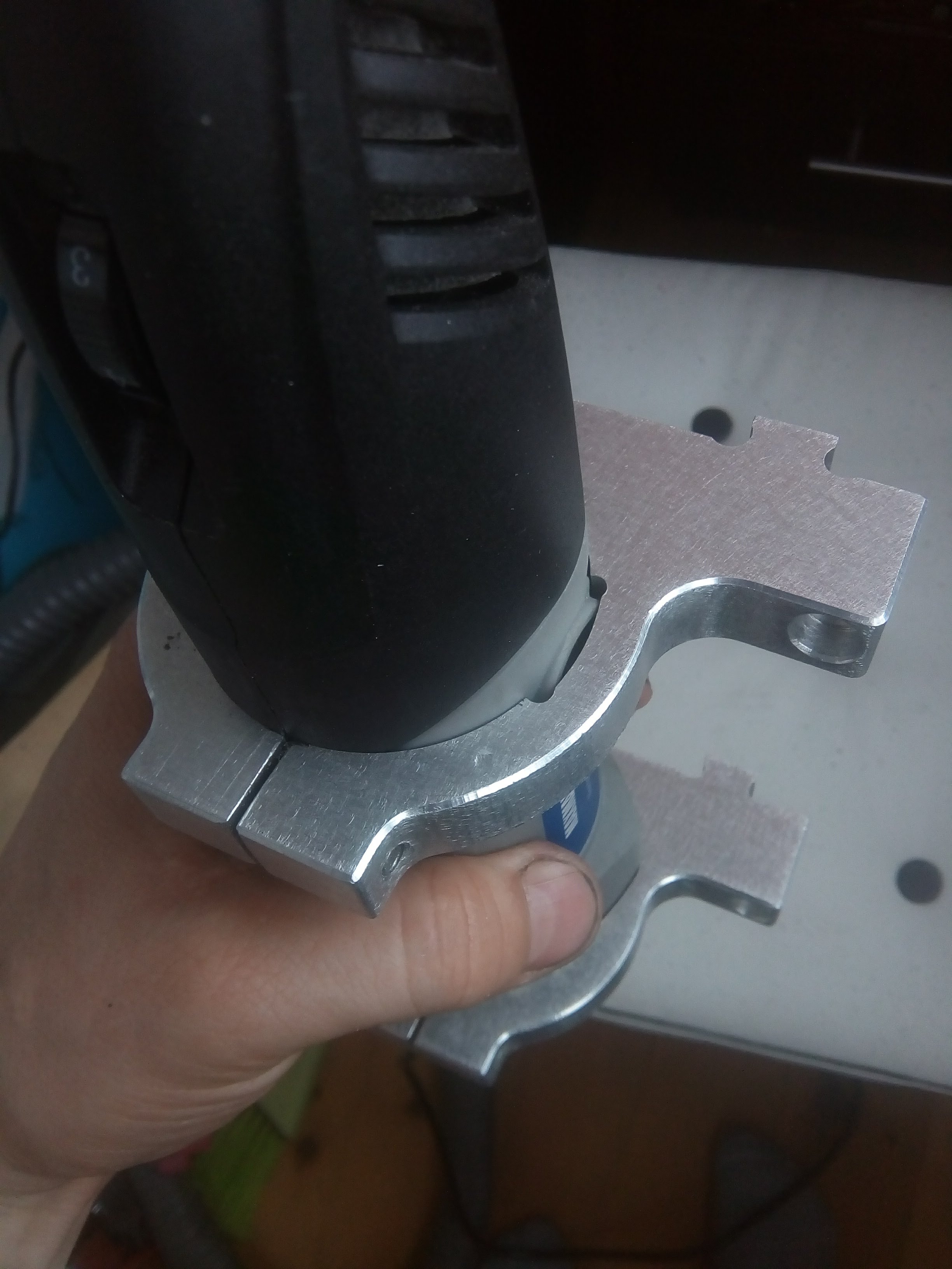 В общем фото модельки. Есть имеющийся держатель шпинделя диаметром 52мм две штуки. Сейчас в одном из них, через переходную втулку зажата hilda, но не хватает хода из-за высокого расположения. Решил перенести место крепления на корпус d54мм. Нормальные фрезы долго ждать. Нужно быстрее.