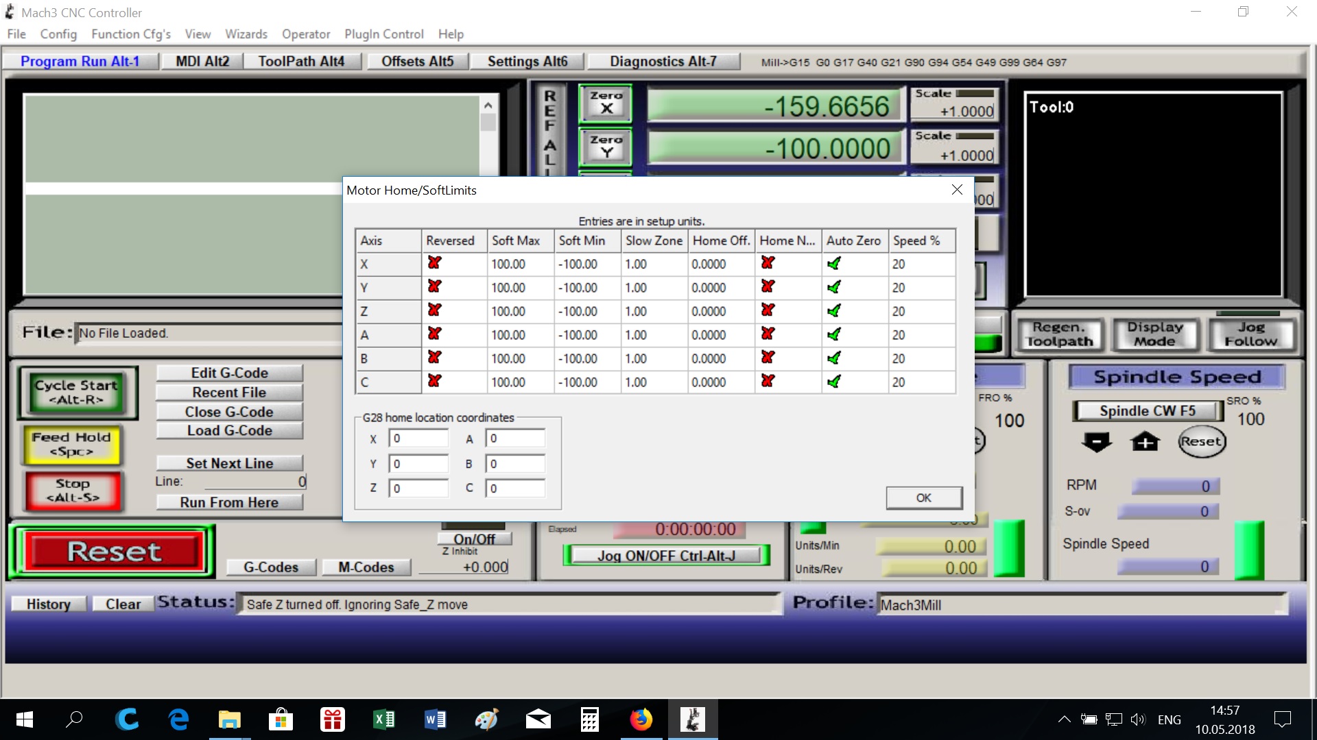 Может, кто-нибудь подскажет, есть ли у мач3 такая функция, как переход шпинделя в центральную точку по осям Х и У относительно рабочего стола?? прошу прощения,если непонятно описал свой вопрос. Допустим рабочее пространство станка 600мм*900мм, то есть мне необходимо чтобы при включении станка я с помощью нажатия неизвестной чудо кнопки в мач3 переместил шпиндель в координаты х=300 у=450 (ну вот как то так чтоли)