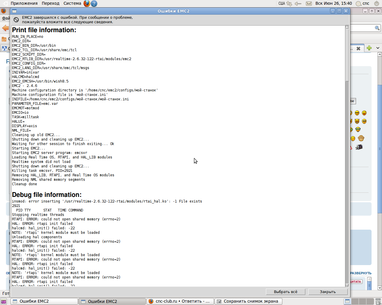 Аftaev извини не знал поэтому сделал фото(теперь буду знать)... после нескольких перезагрузок емс все таки запустился (я подключил его к станку покатал не много вроде ни чего) но постоянно при загрузке вылетает внизу красная надпись что RTAI не запущен.