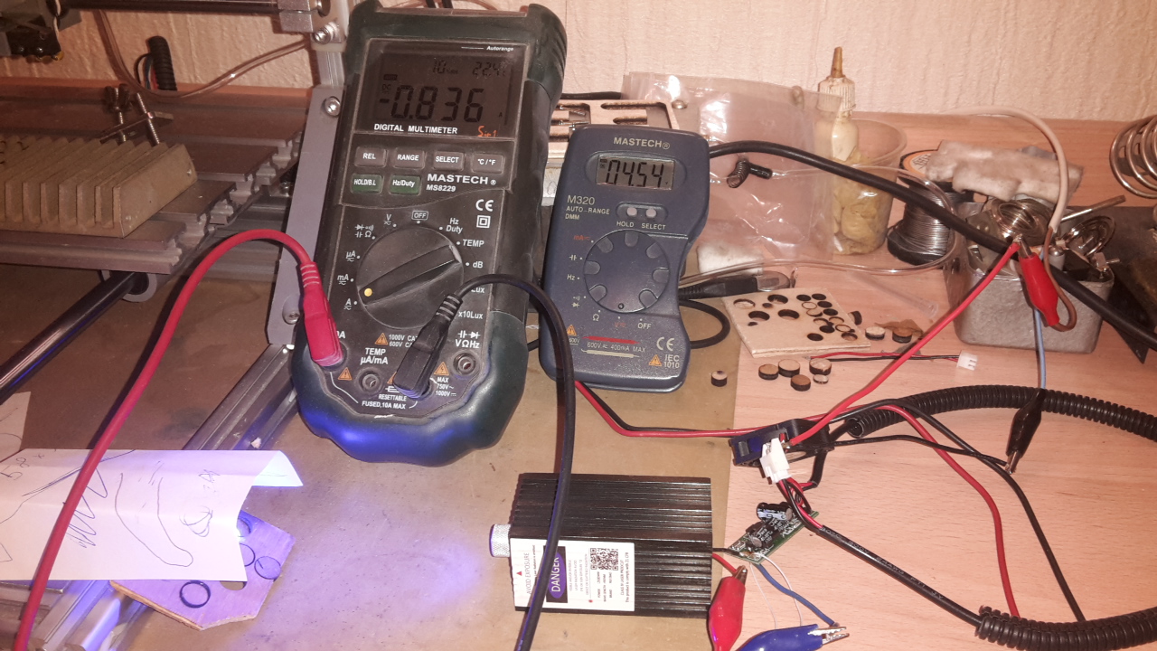 ну если присмотреться к цифрам на амперметре и напряжеметре, то видно, что 2,5 Вт там только на этикетке, а реально около 1,3.. однако именно он шел в комплекте со станком.