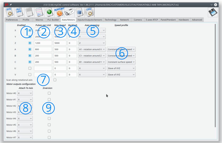 Полученное значение (8 000 имп/мм , 16 000 имп/мм, или полученное в соответствии с выбранной частотой Step) нужно занести в ячейку, обозначенную номером 2 (Pulse per Unit) на скриншоте. Также не забыть установить чекбокс 1 (Enable) и соответствие мотора и оси в ячейке 5 (Axis mapping).