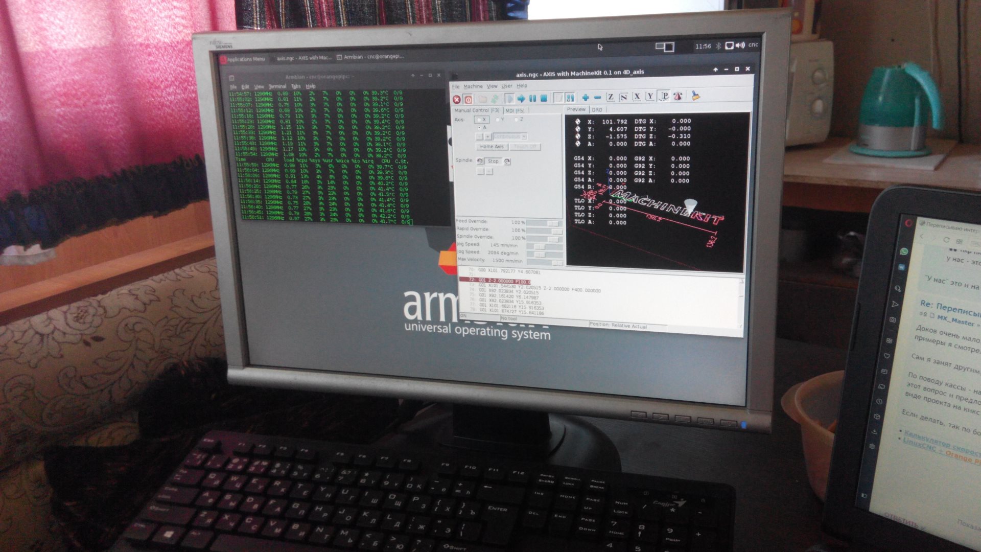 Именно в этом образе все настройки базовой системы оставлены по умолчанию, так что CPU работает на 408 MHz, надо разогнать.....donvictorio писал(а):я запустил образ от svb, на нем axis завелся, но все равно есть проблема с повторным запуском emc после закрытия. то есть не получится запустить программу, закрыть и снова открыть - вываливается ошибка. не знаю, с чем связано. вечером потестирую, еще. вопрос - есть какой-то htop, который показывает активность видеоядра? как я узнаю, что дрово завелось и насилует мали?