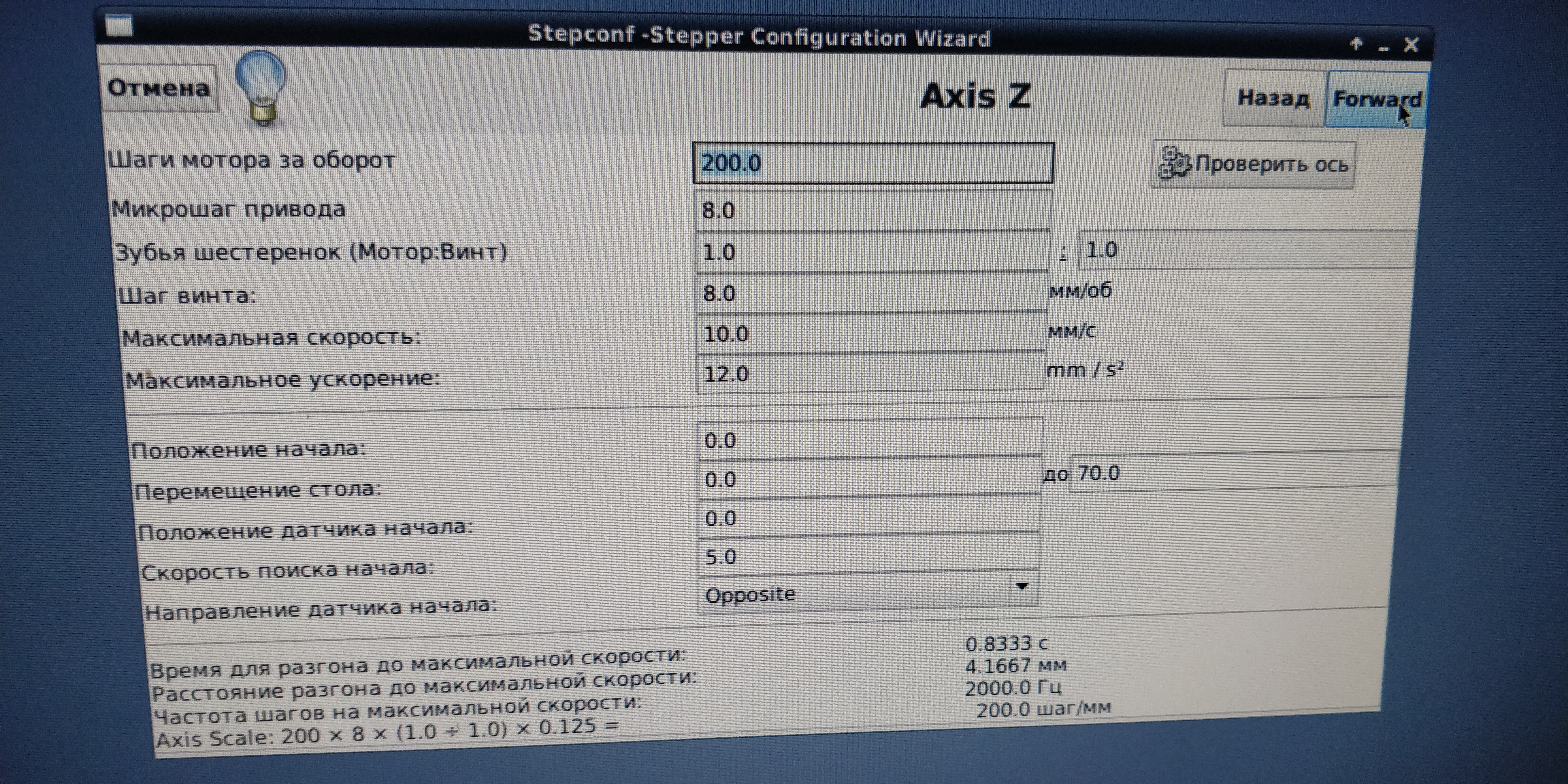 После введения всех параметров ось можно протестировать. Для этого нажимаем Test this axis.