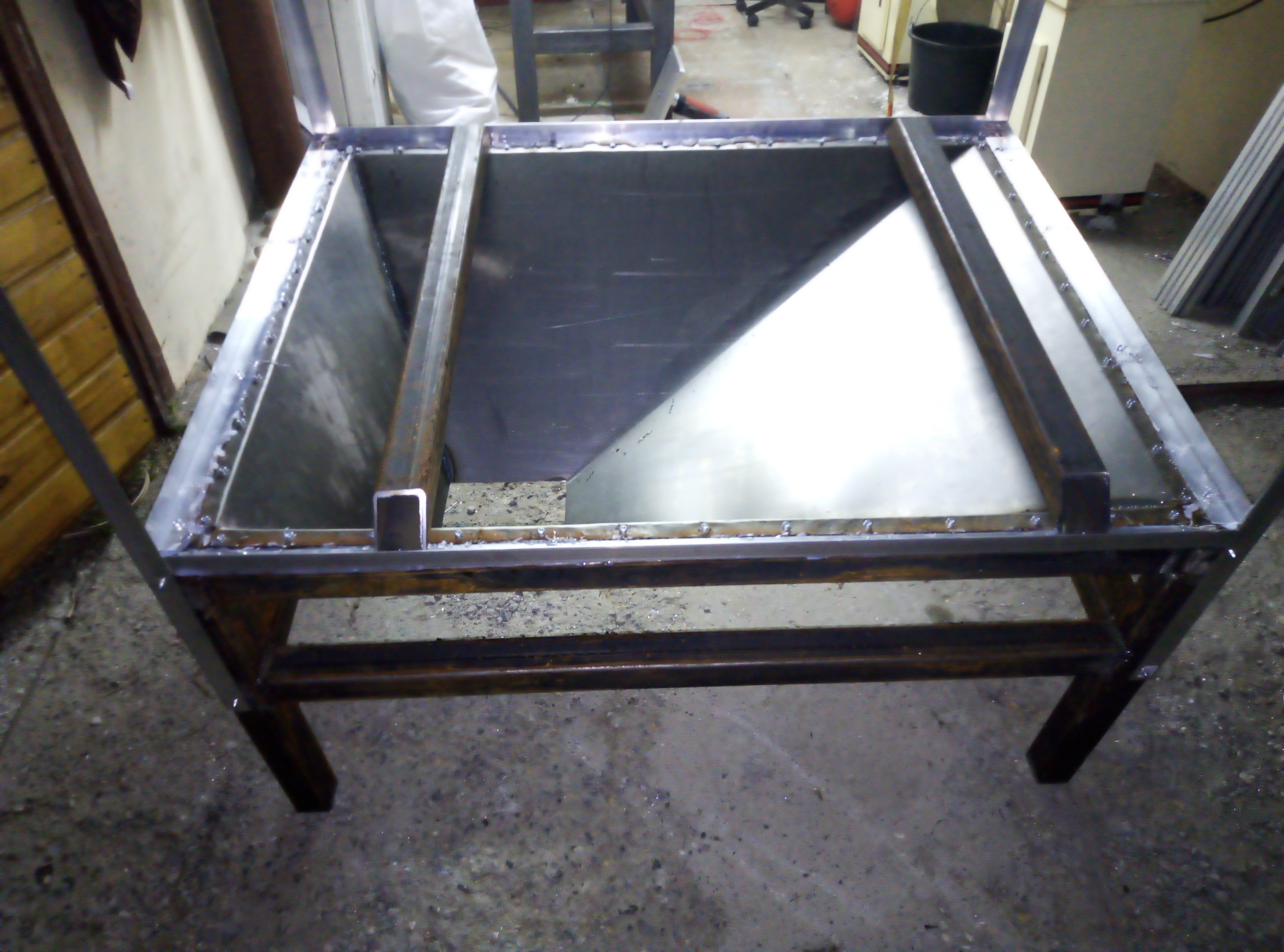 Сделал бы почти такой же кабинет но из алюминевых труб, так же и слив сделал бы из алюм.листа. Сталь нужно красить и она тяжёлая. Отдал бы слив на раскрой и гибку.