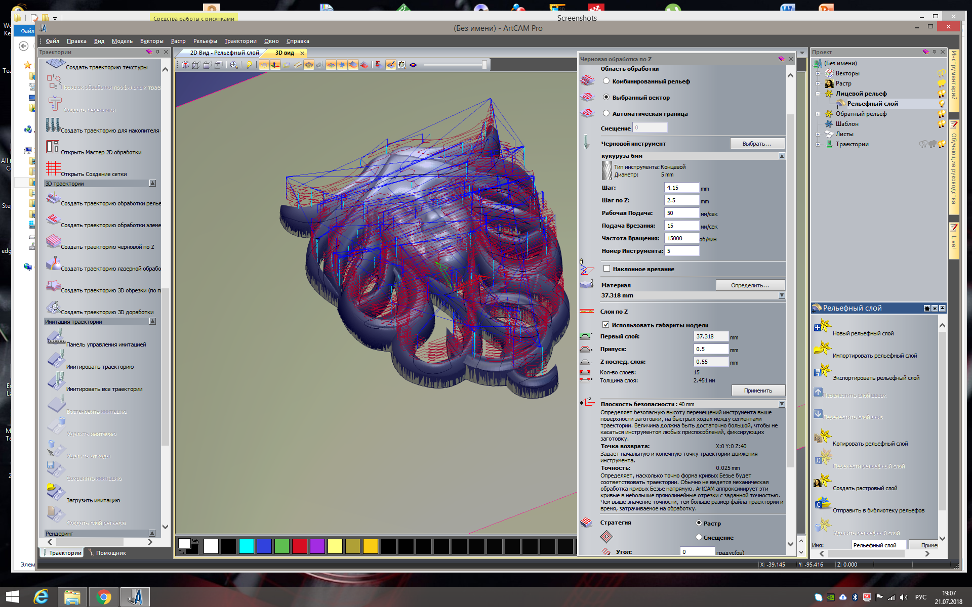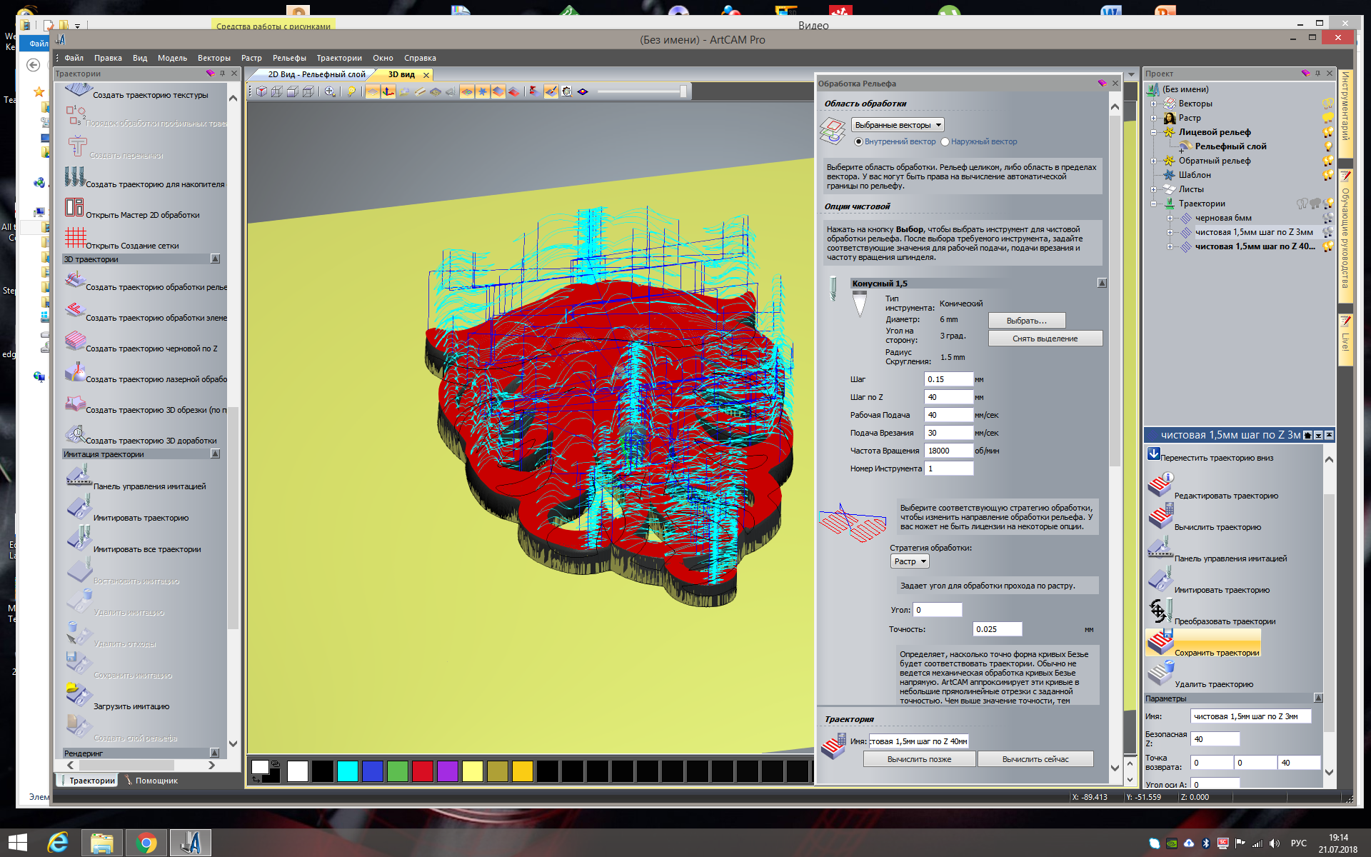 Далее выбираем "Создать траекторию обработки рельефа" - например морковка R1,5мм Получаем и режем по этой УП чистовую.