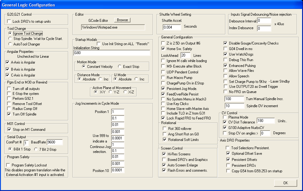 Станок подключен в компьютеру, настроены софтлимиты (возможно, неправильно, смущает ось Z). В ручном режиме все управляется, настроены ускорения и количество шагов на мм.