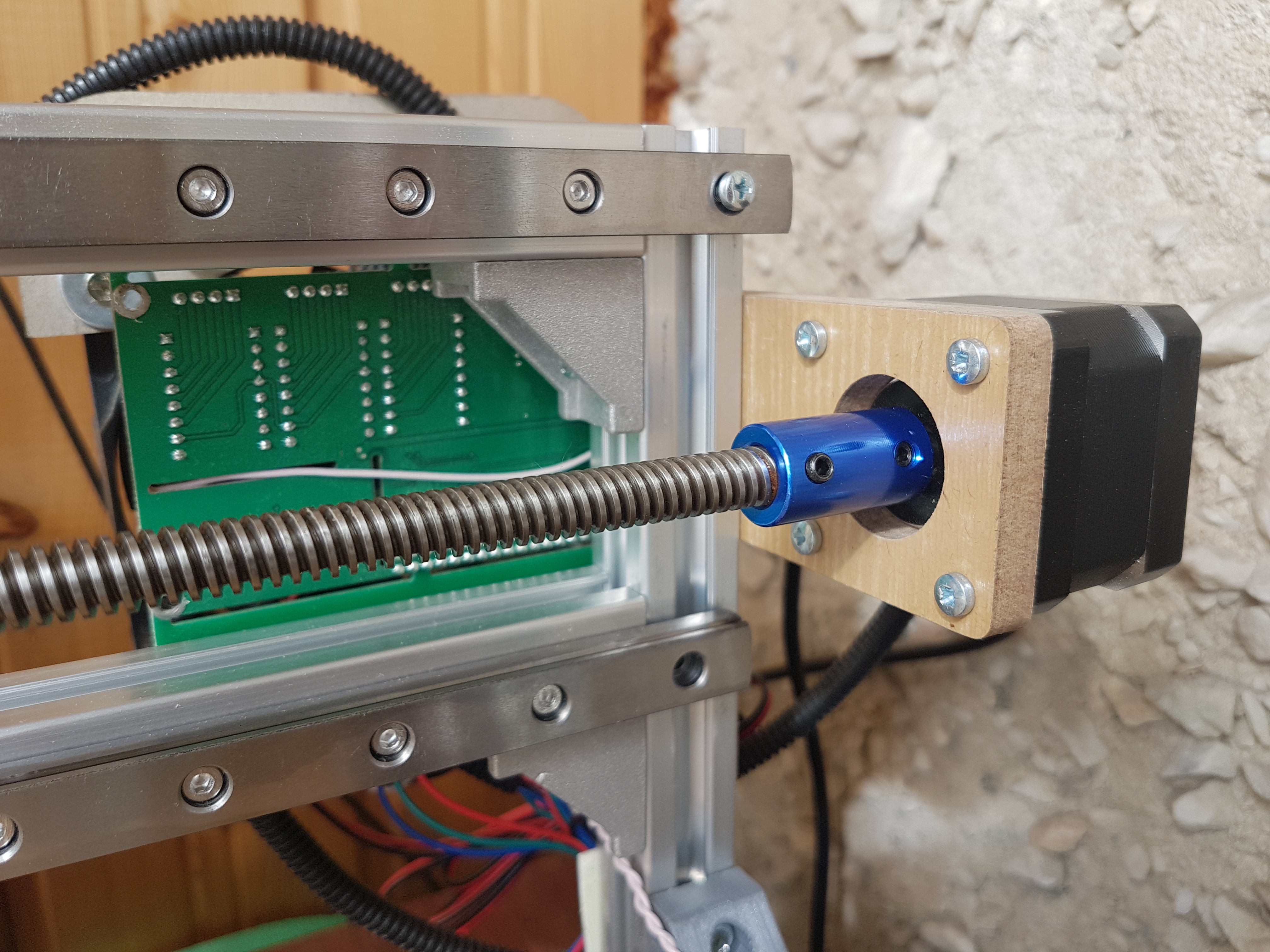Пришлось переделывать крепление винта - выпилил крепление для шагового двигателя и подшипника из того же 8 мм ламината.