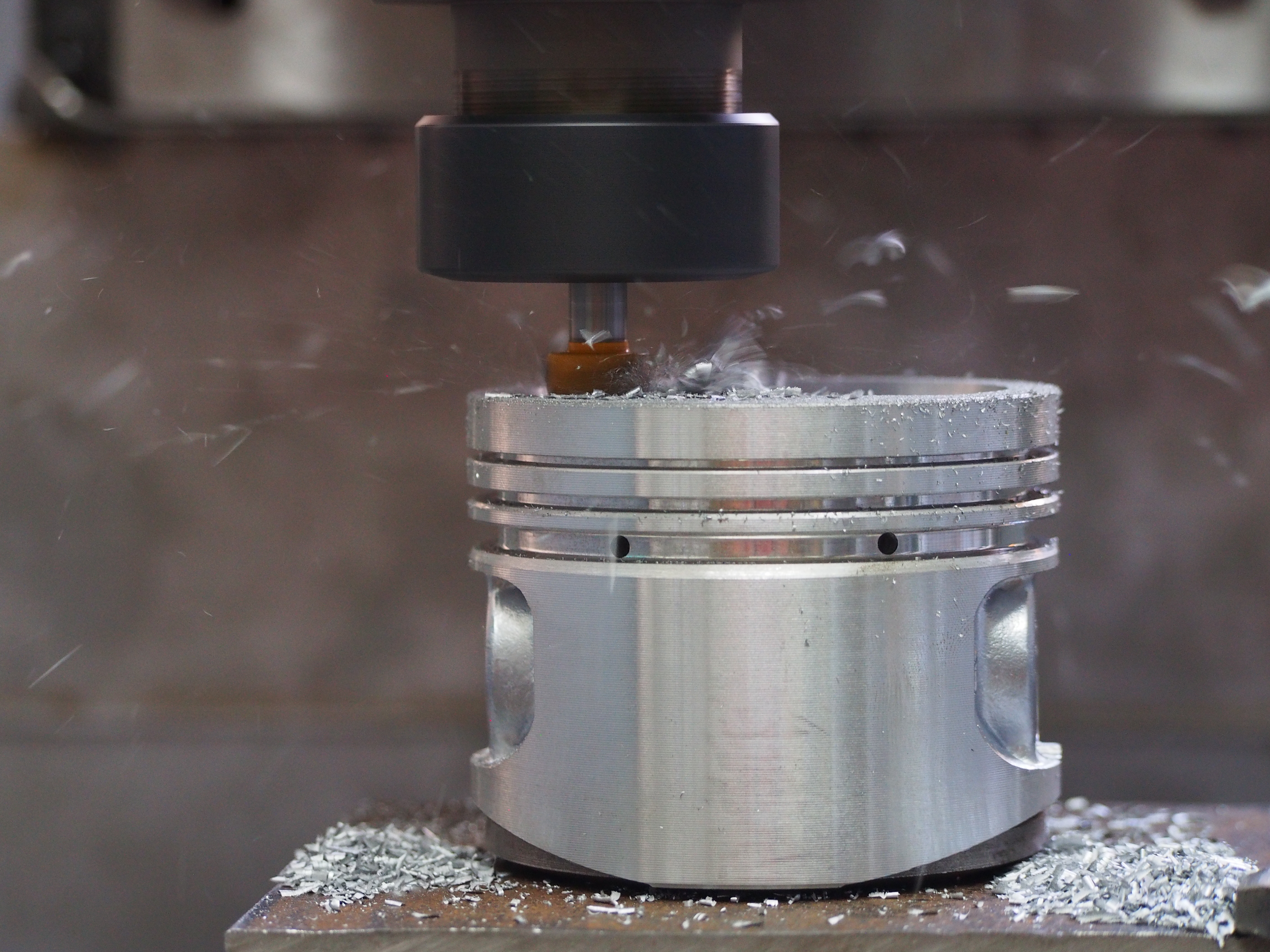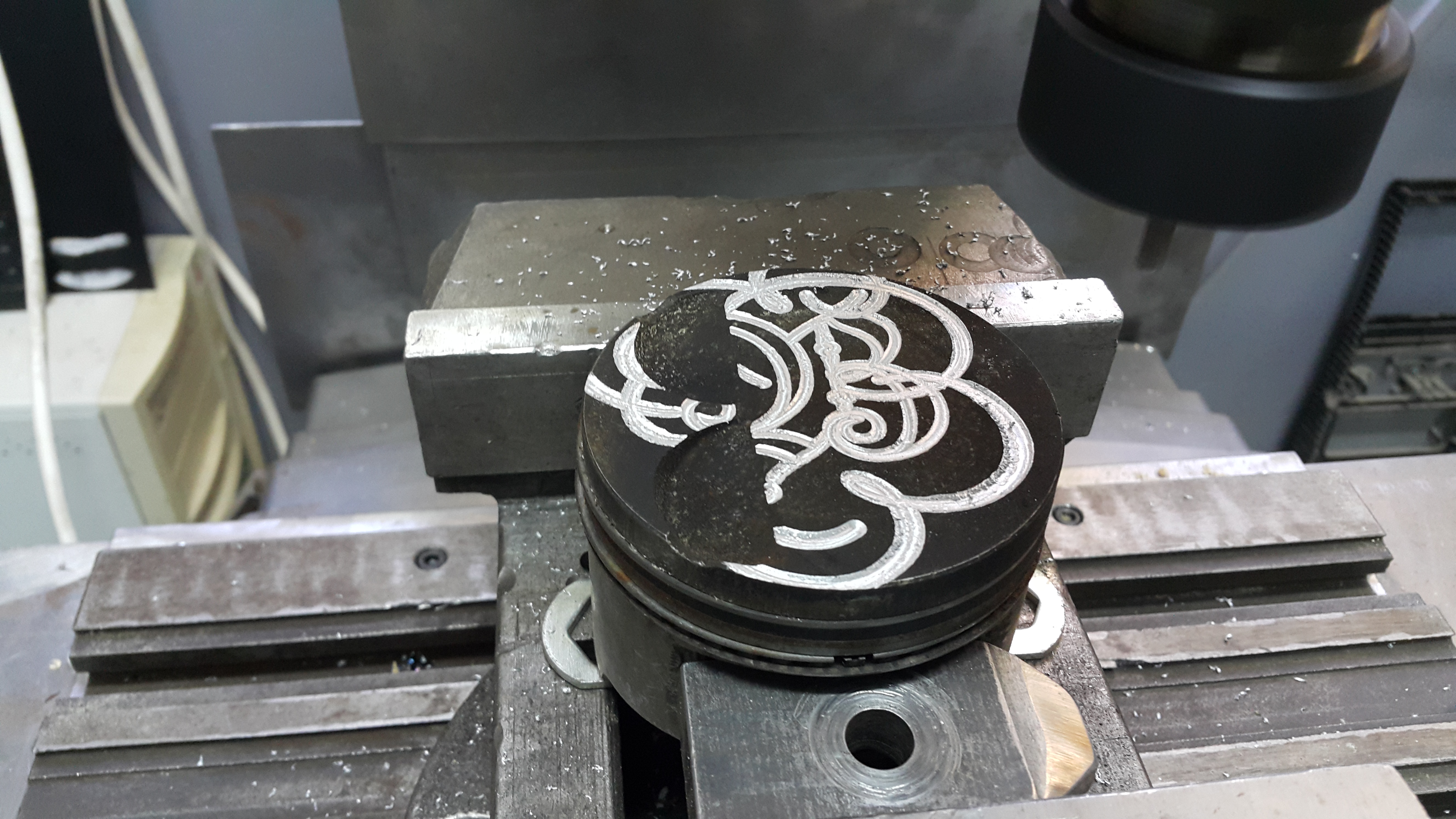 Обороты 3000 подача 200мм/мин съем максимальный 7.3 мм по высоте и 1 мм на сторону за проход. Итого один поршень делается за 9 минут 30 сек. Раньше мне на 4 поршня приходилось тратить 2-3 часа. Делал на поворотном столе по лимбам и индикаторам. Муторная работа. Хорошо когда лужи круглые, тогда можно на токарке там побыстрее конечно.
