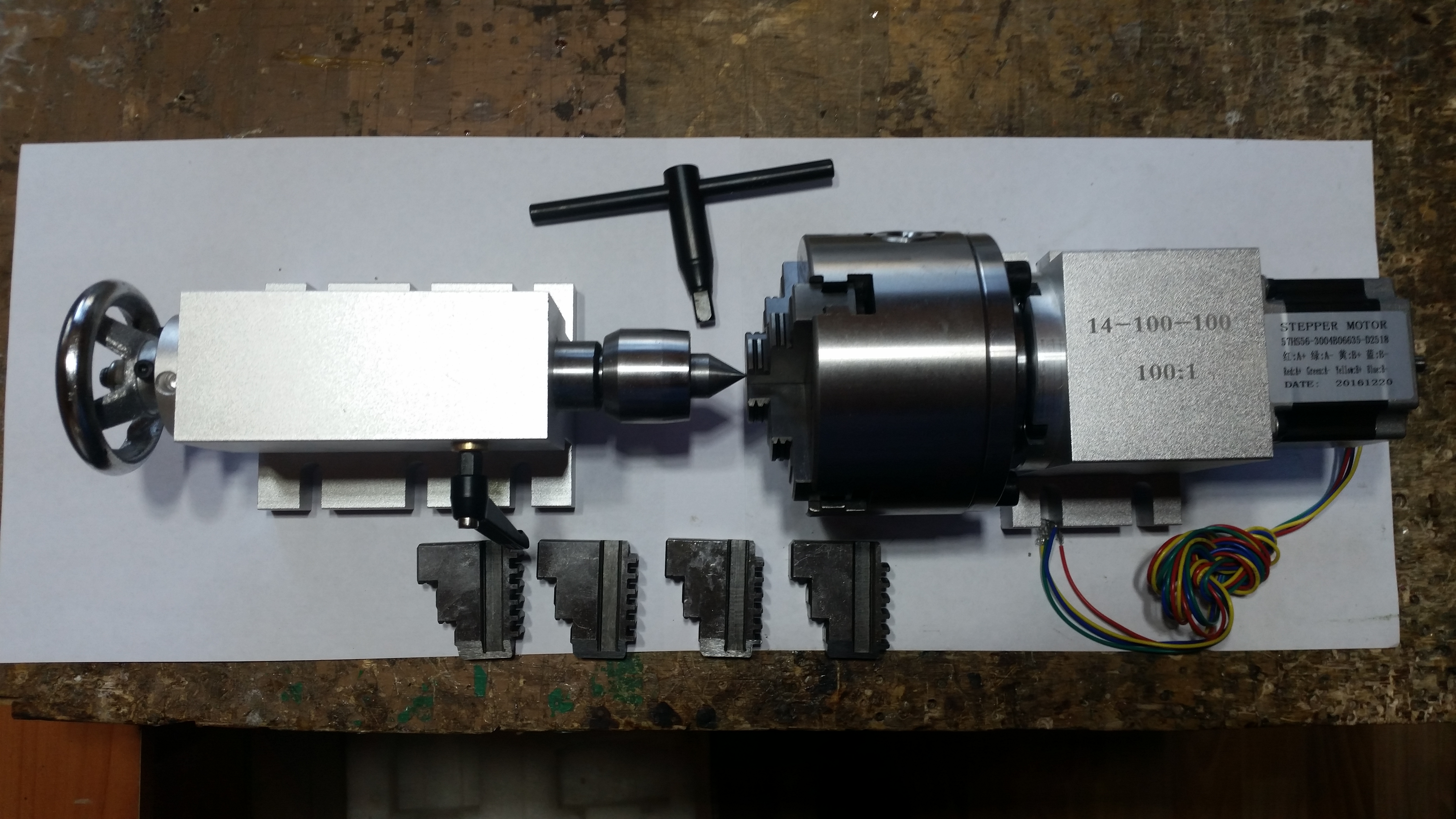 Продам поворотную ось на волновом редукторе (редуктор японский, называется как-то ...25НD), передаточное 1 к 100, задняя бабка + патрон на 100 с прямыми + обратные кулачки + мотор, все новое в работе не было.