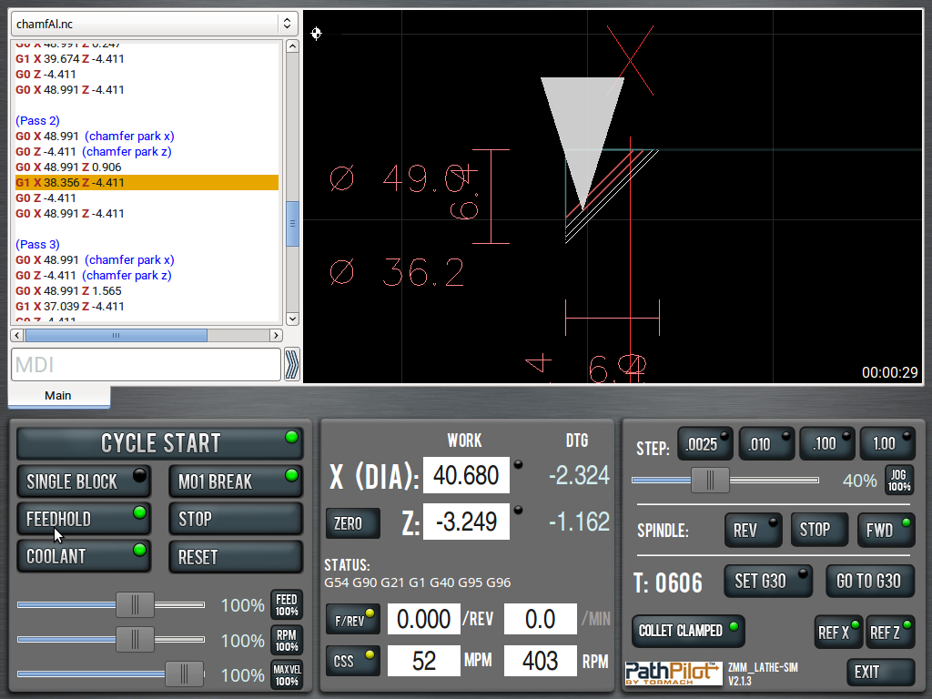 Кстати, а у меня другая проблема - если при точении резьбы задать шаг резьбы 2мм, то станок нарежет резьбу с шагом 1мм. Что бы получить нужный шаг резьбы, число приходится умножать на 2. К примеру нужен шаг 2мм - задаем шаг 4мм.