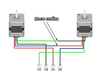 Все оси работают хорошо, а шаговики на оси Z подключенные последовательно, и вращаются в разные стороны (левый шаговик против часовой, правый за часовой), соединял по схеме ниже