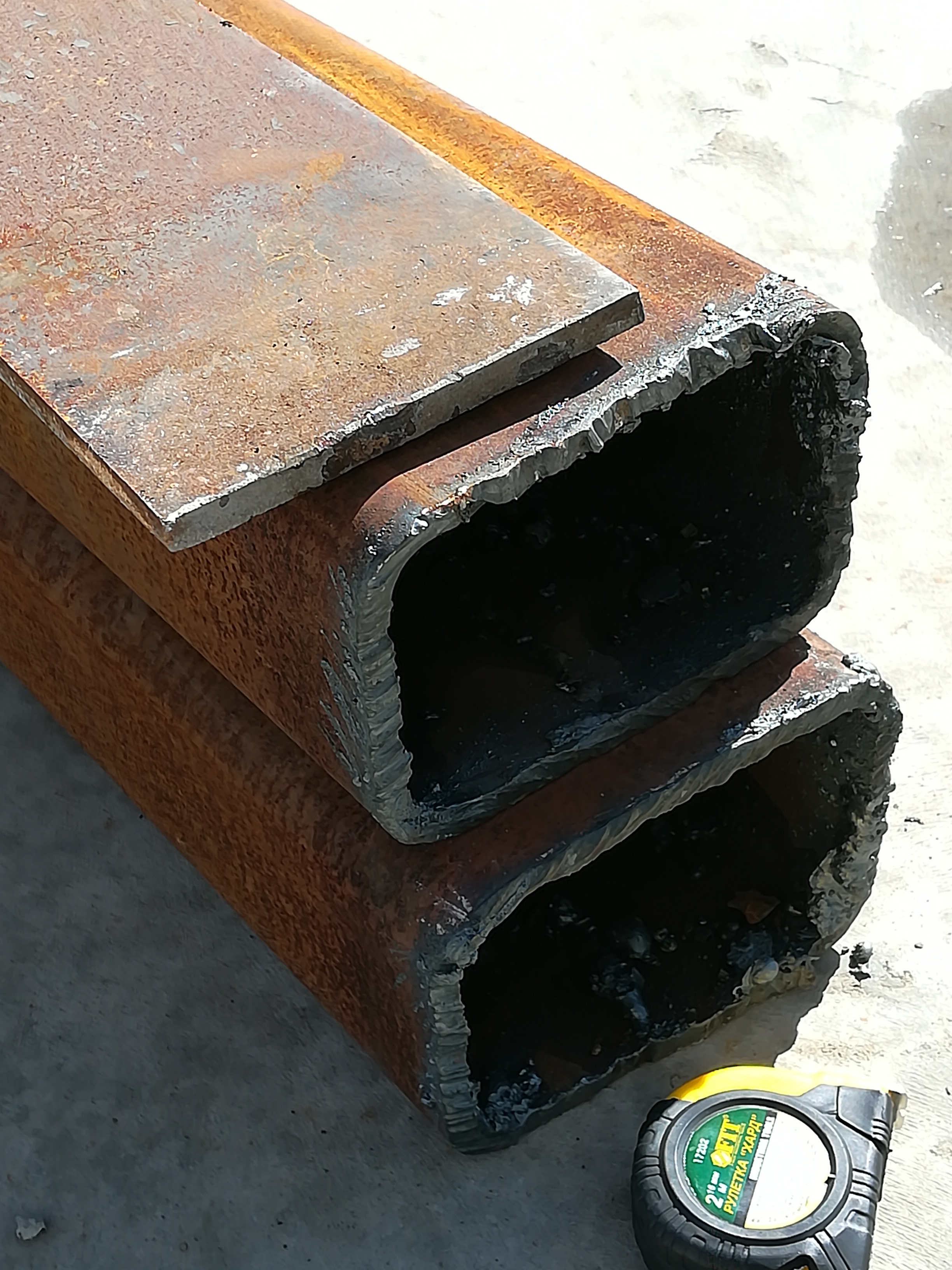 Удалось достать на местом металлоломе пару обрезков толстостенной трубы 100х150х8. Метр - 25 кг. Отдали недёшево, так как труба новая и не сильно ржавая. По виду очень солидная и жёсткая. Немного лишнего пришлось взять - буду продавать.