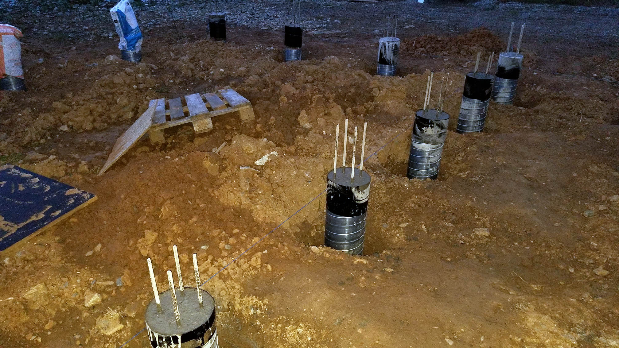 Купил жестяные трубы для несъемной опалубки колонн. В Екатеринбурге изготовили мне армокаркасы для колонн (это оказалось дешевле, чем покупать арматуру в Новоуральске). Приобрел маленькую бетономешалку в ОБИ за 6000 руб, привез песок, щебень, разметил участок и начал бурить.