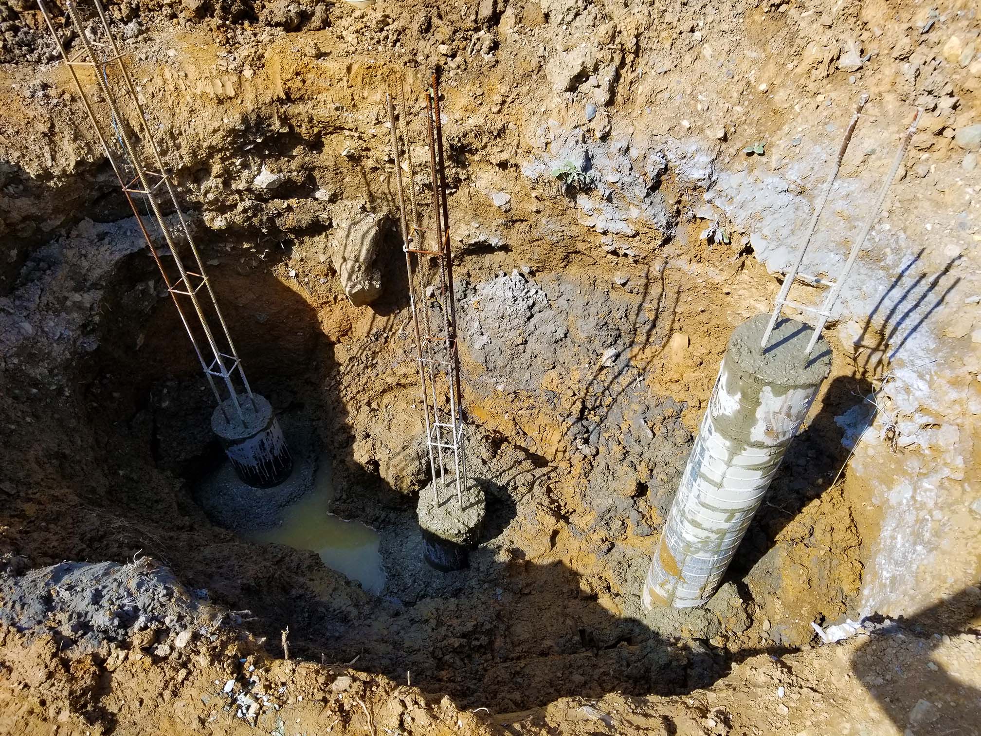 Естественно, что на следующий день после бурения был ливень и все ямы осыпались. Купил ручной бур, сварочник, трубу, нарастил и сделал длинный ручной бур, и так по одной яме вычищал, отсыпал цементом, чтобы впитать остатки влаги, и заливал бетоном.