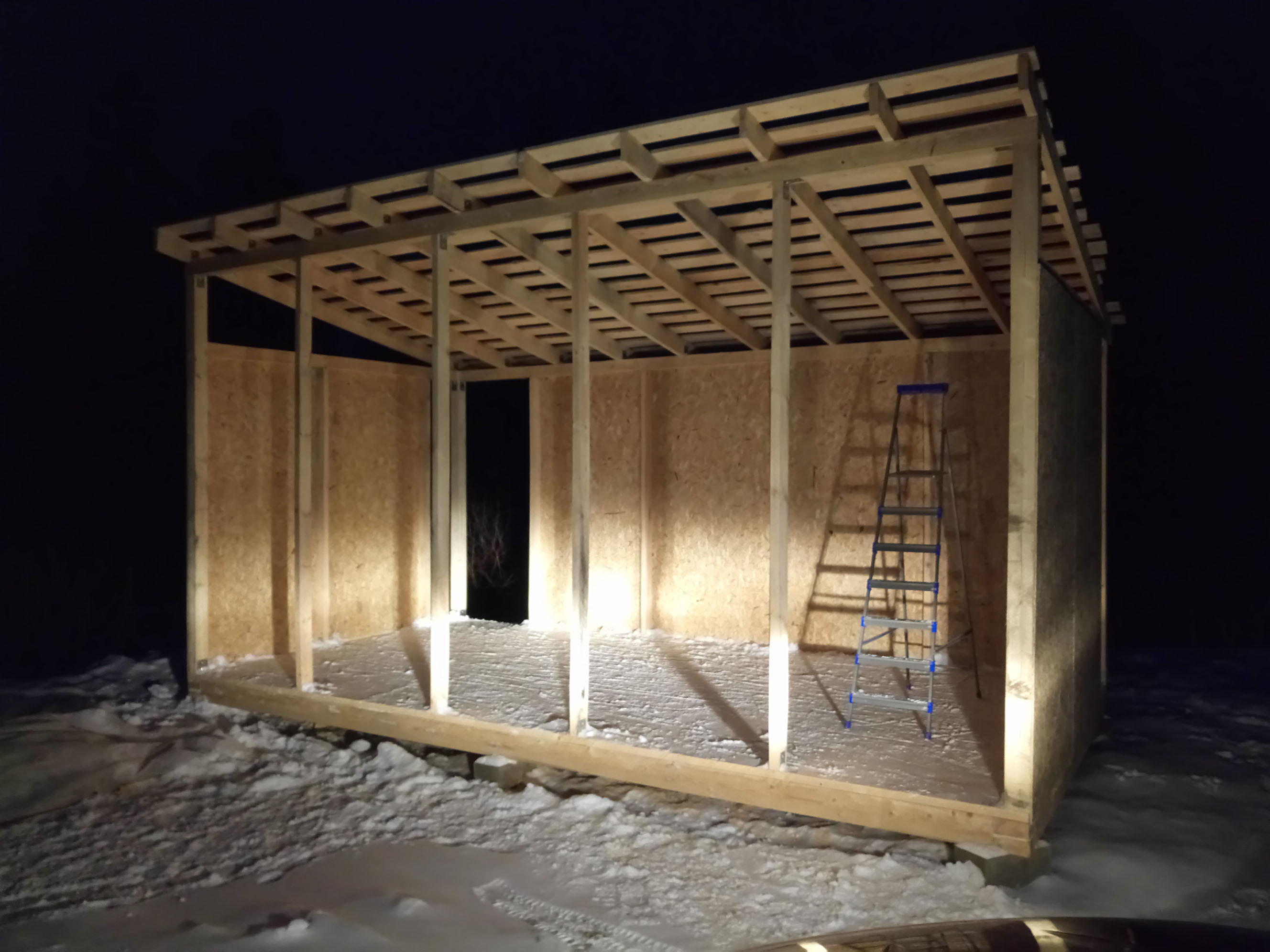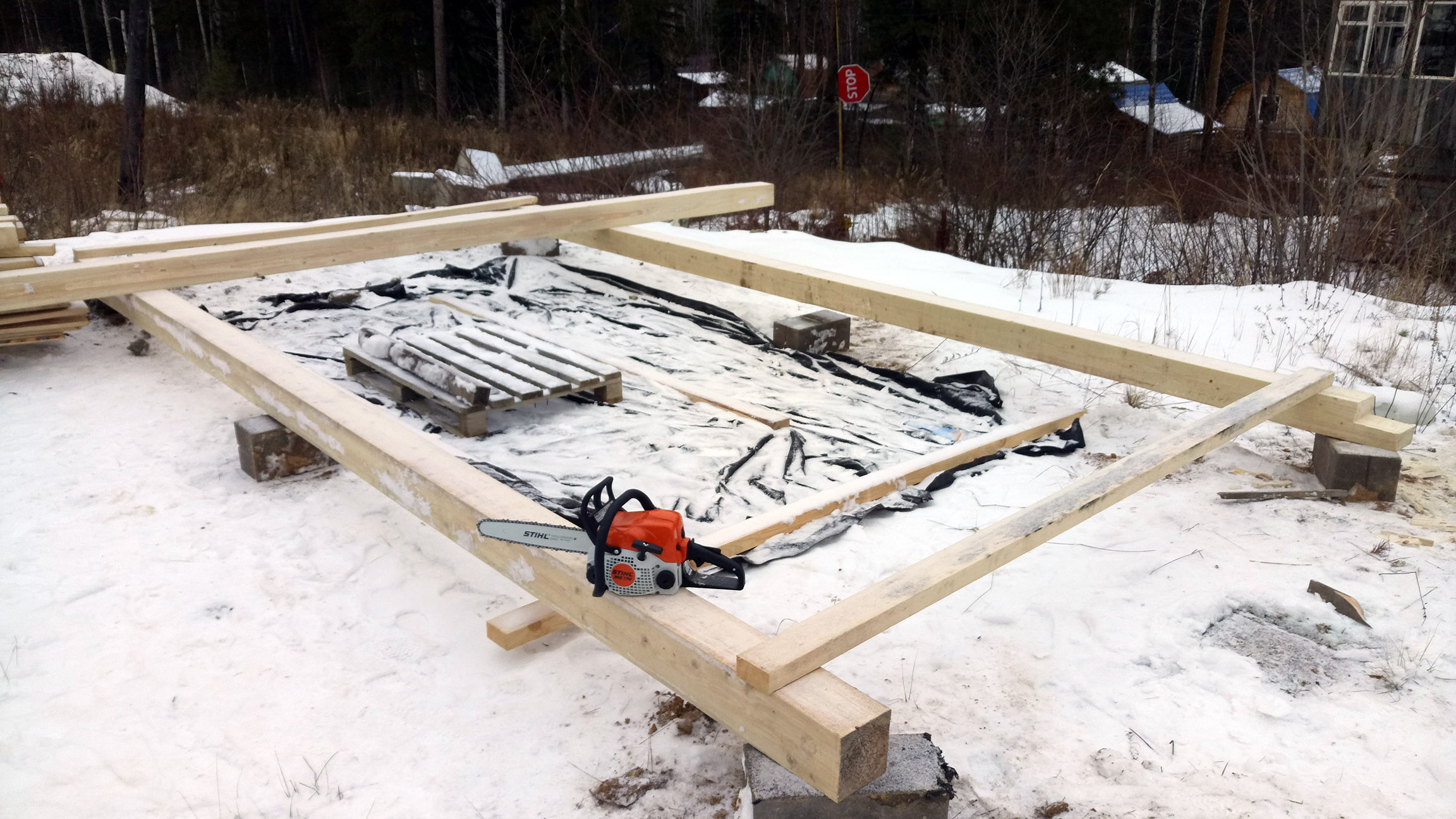 Первым делом нужно было построить сарайку, чтобы было где хранить инструменты.