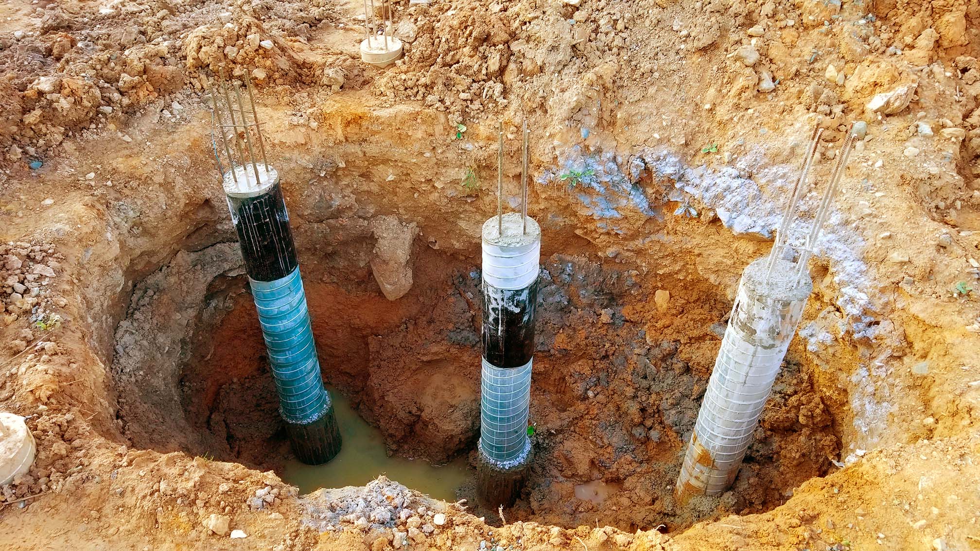 Естественно, что на следующий день после бурения был ливень и все ямы осыпались. Купил ручной бур, сварочник, трубу, нарастил и сделал длинный ручной бур, и так по одной яме вычищал, отсыпал цементом, чтобы впитать остатки влаги, и заливал бетоном.