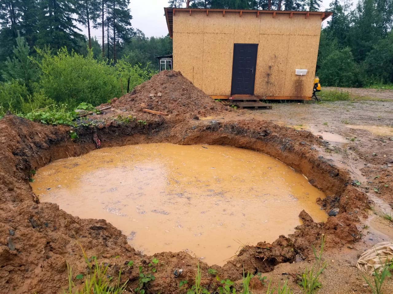 Откачал воду, откопал глину, но дождь не прекращался. Решил, что страшного ничего не случится, т.к. нижние кольца уже установлены, а до конца все я поставить не мог, т.к. бетонный завод уже месяц тянул резину с изготовлением оставшихся колец.