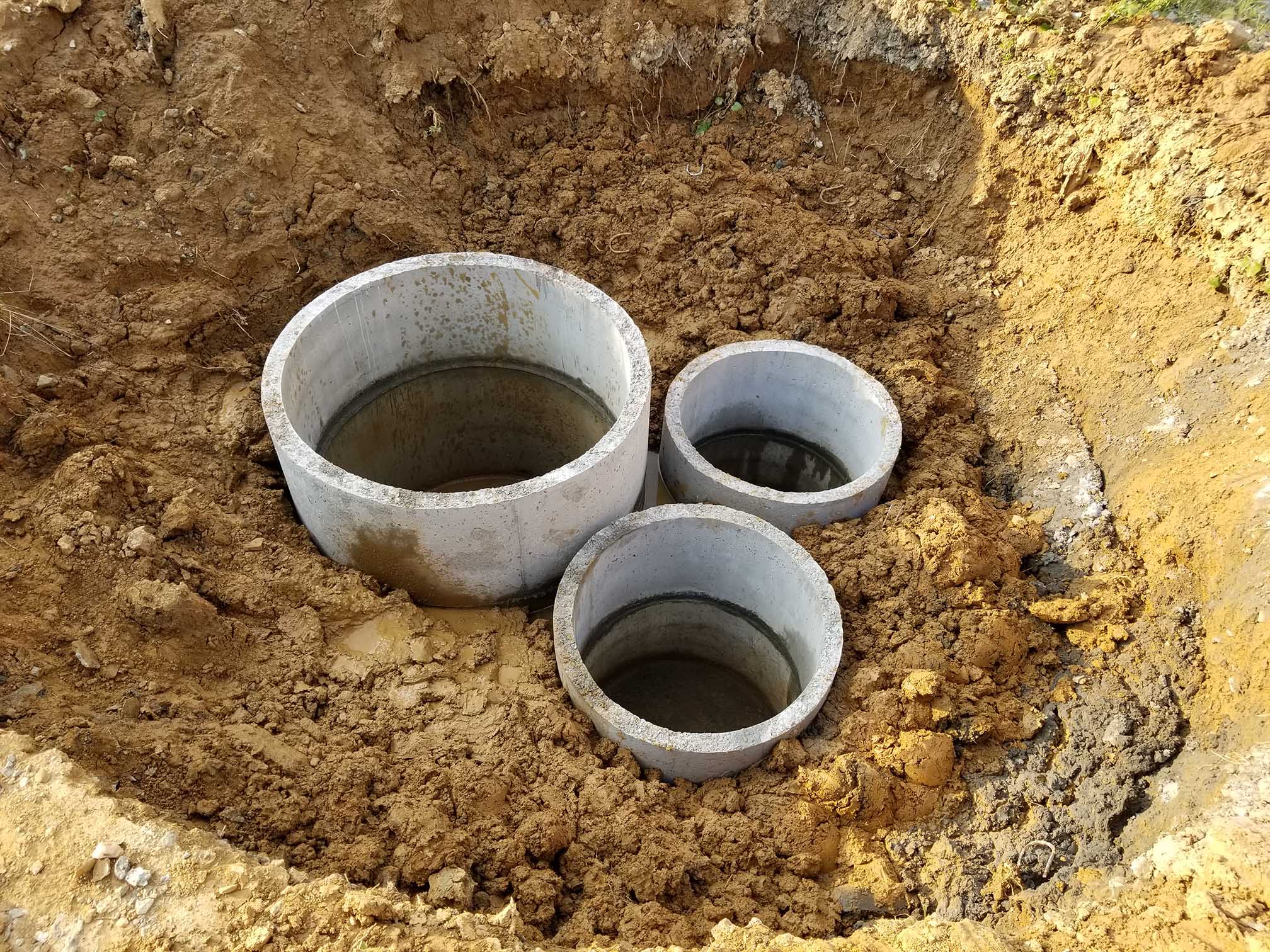 На следующий день нашел свободный манипулятор и поставил три бетонных кольца по одному на каждую "банку" (уже были куплены). Больше времени у манипулятора не было, и он меня оставил на этом этапе. К тому же поздно уже было и дождь пошел, а ему вечером в дождь работать не хотелось.