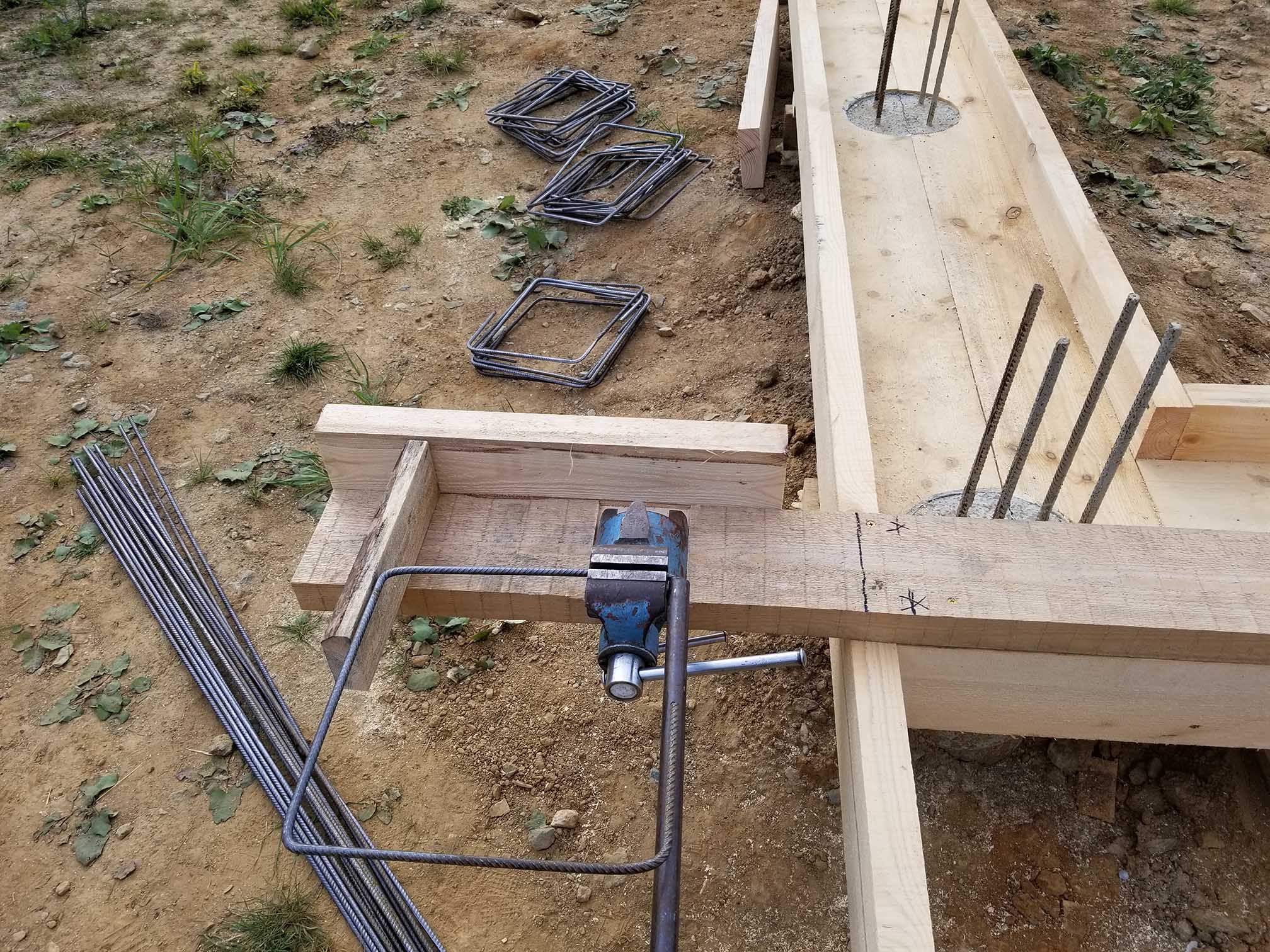Арматуру 12 мм гнул с помощью двух труб. Хомуты — в тисках. Сделал шаблон-ограничитель для ускорения процесса.