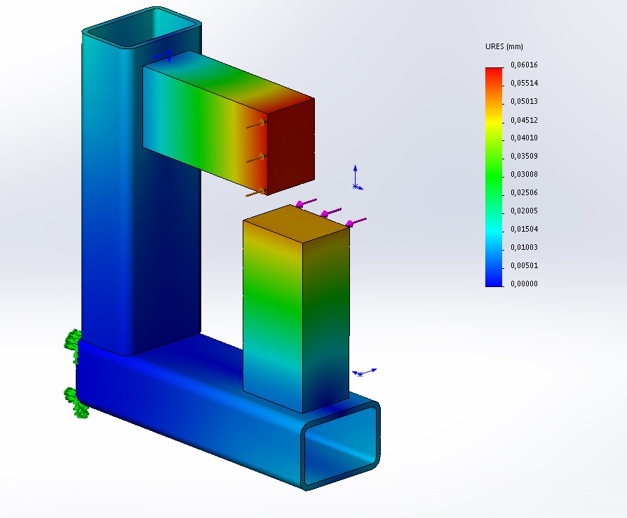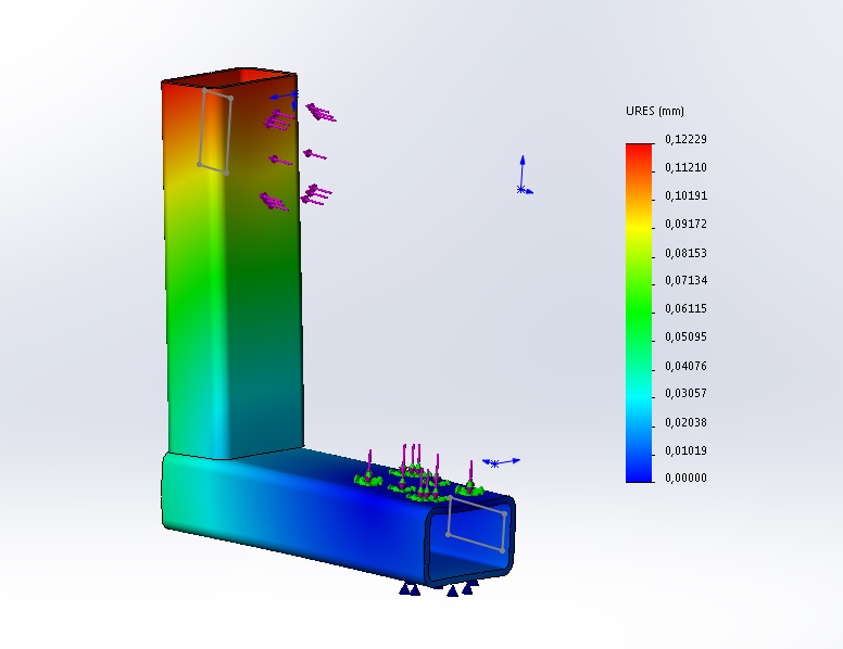 Igor1 писал(а):Согнул в Simulation однотрубную конструкцию. Труба 100х150х8 лёжа. Имитировал усилие от сверления сверлом 5 мм, поставил усилие 40 кг. Результат - конструкция деформировалась на 0,12 мм. Думаю, что это неприемлемо много.