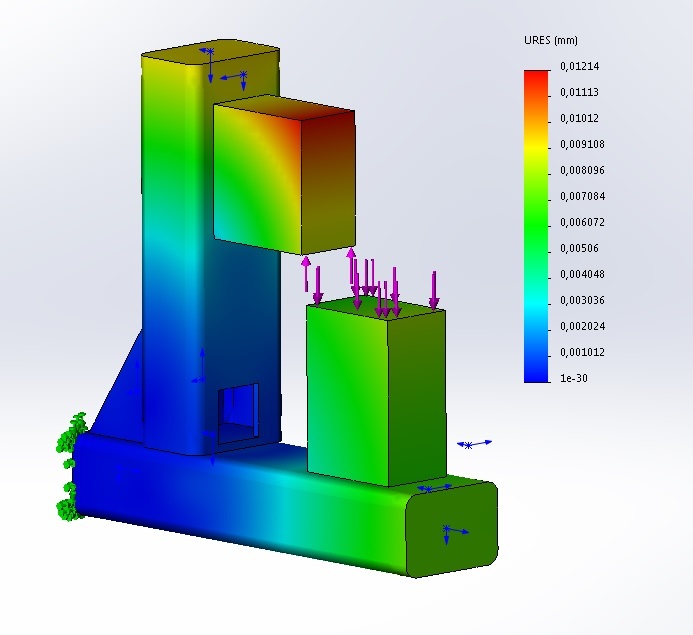 Перерисовал с усилениями, заглушками, косынками. Имитация сверления, те же 40 кг. Прогиб в районе шпинделя/детали уменьшился до 16 микрон! Результат существенно улучшился. Как думаете - это достаточно? Надо иметь ввиду, что это только прогиб рамы. Потом добавятся деформация кареток, столов, винтов, подшипников, там рычаги поменьше и прогибы должны быть меньше, но всё же.