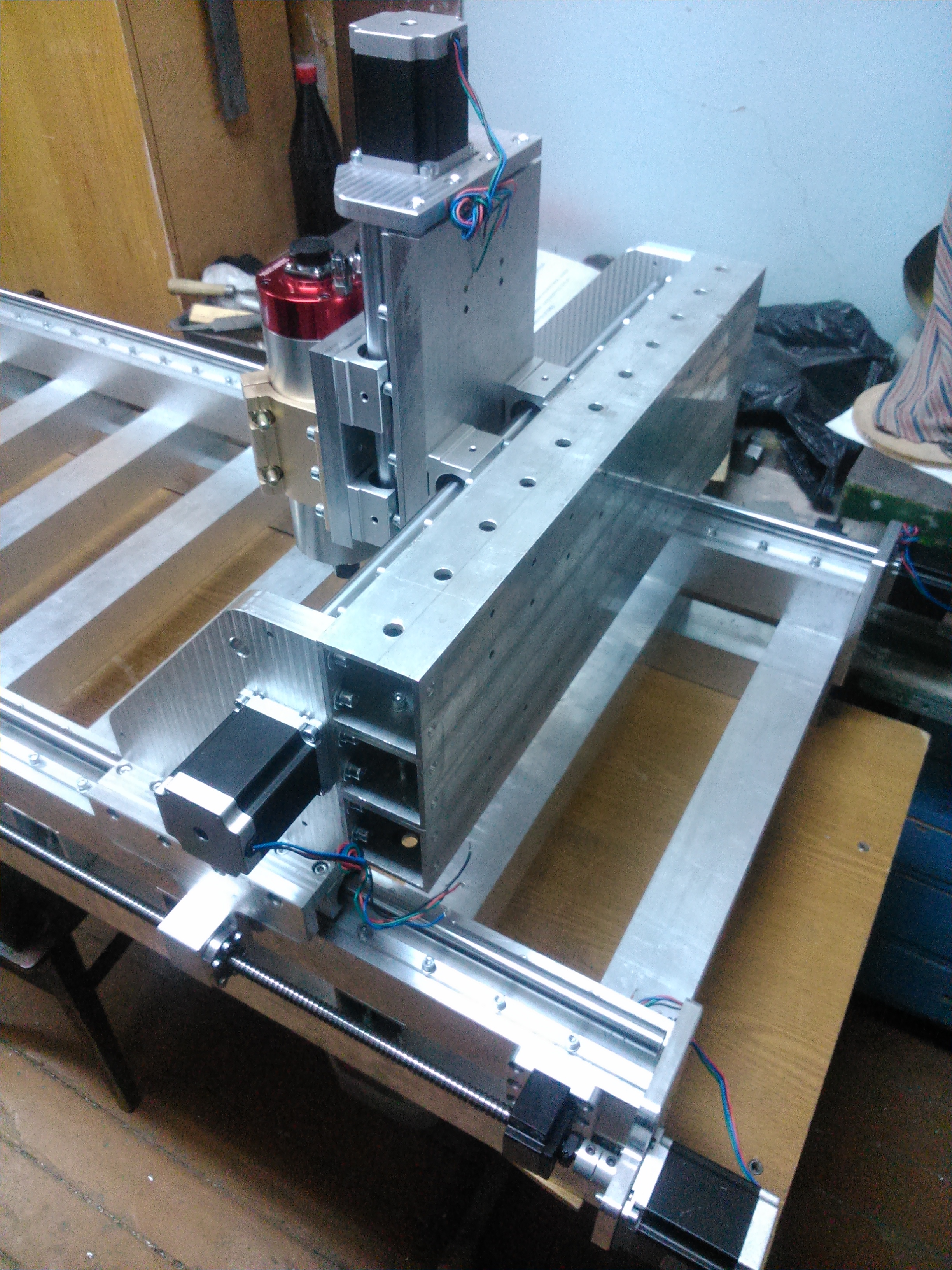 Параллельность портала столу вывел, по линейке, поставленной поперек , прямо на рельсы, одну сторону балки закрепил к боковине жестко, под вторую поставил импровизированный "домкратик"- болт с накрученной на него гайкой. Прокатывал ось Z вдоль портала и отслеживал значения отклонения по индикатору, "домкратиком" выровнял показания с обоих краев. Поскольку прямолинейность рельс на портале была выставлена заранее, дополнительно ничего юстировать не пришлось.