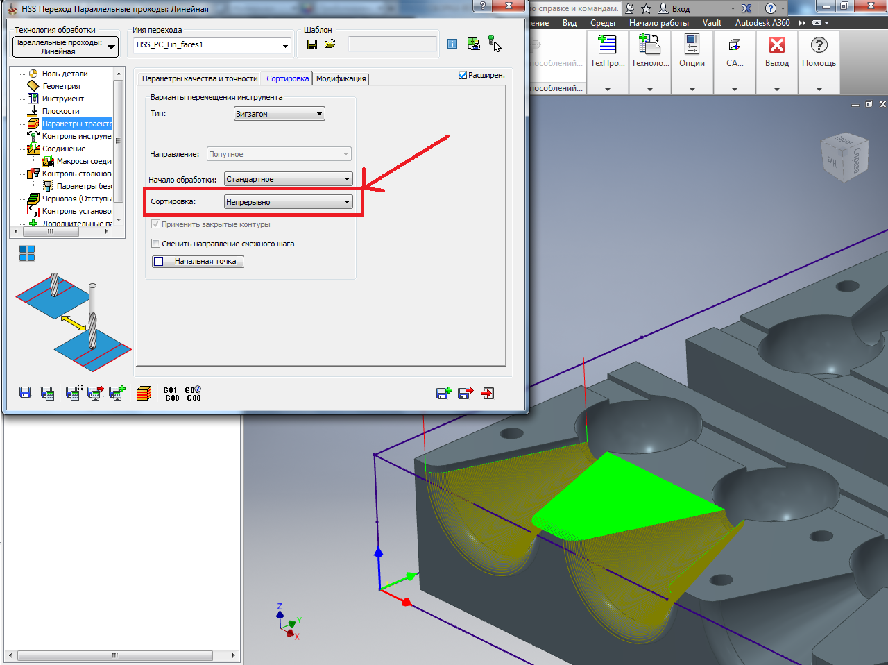 Смотрим, есть деталь с множеством однотипных операций, а именно, HSS параллельные проходы, линейная. Выбираю поверхность обработки (а точнее две поверхности, сам желоб и скругление), настраиваю как мне надо (инструмент, смежный шаг, продлить начало обработки на 80%, и меняю соединения траектории на "прямое", чтобы инструмент был всегда на поверхности обработки и не поднимался на безопасную высоту). Тут всё устраивает. Однако, если я выбираю две и более однотипные поверхности, то инструмент начинает бегать от одной поверхности к другой. Если установить галочку Сортировка -> Отдельные области, то инструмент сделав первую поверхность по прямой переходит ко второй. Оно то и правильно, я ведь ранее указывал чтобы инструмент обрабатывал поверхность непрерывно, без поднятия. Но это почему то распространяется на переход от одной поверхности к другой. Меняю соединение траектории, инструмент теперь переезжает как надо, но вот поднятие его в ненужных местах огорчает Пробовал и на разных моделях, то есть в сборке у меня две CAD модели и выбираю я поверхности на разных моделях - инструмент не понимает что надо перед переходом к другой модели подняться на безопасную. Это глюк программы, моя криворукость или неправильно выбранная стратегия?