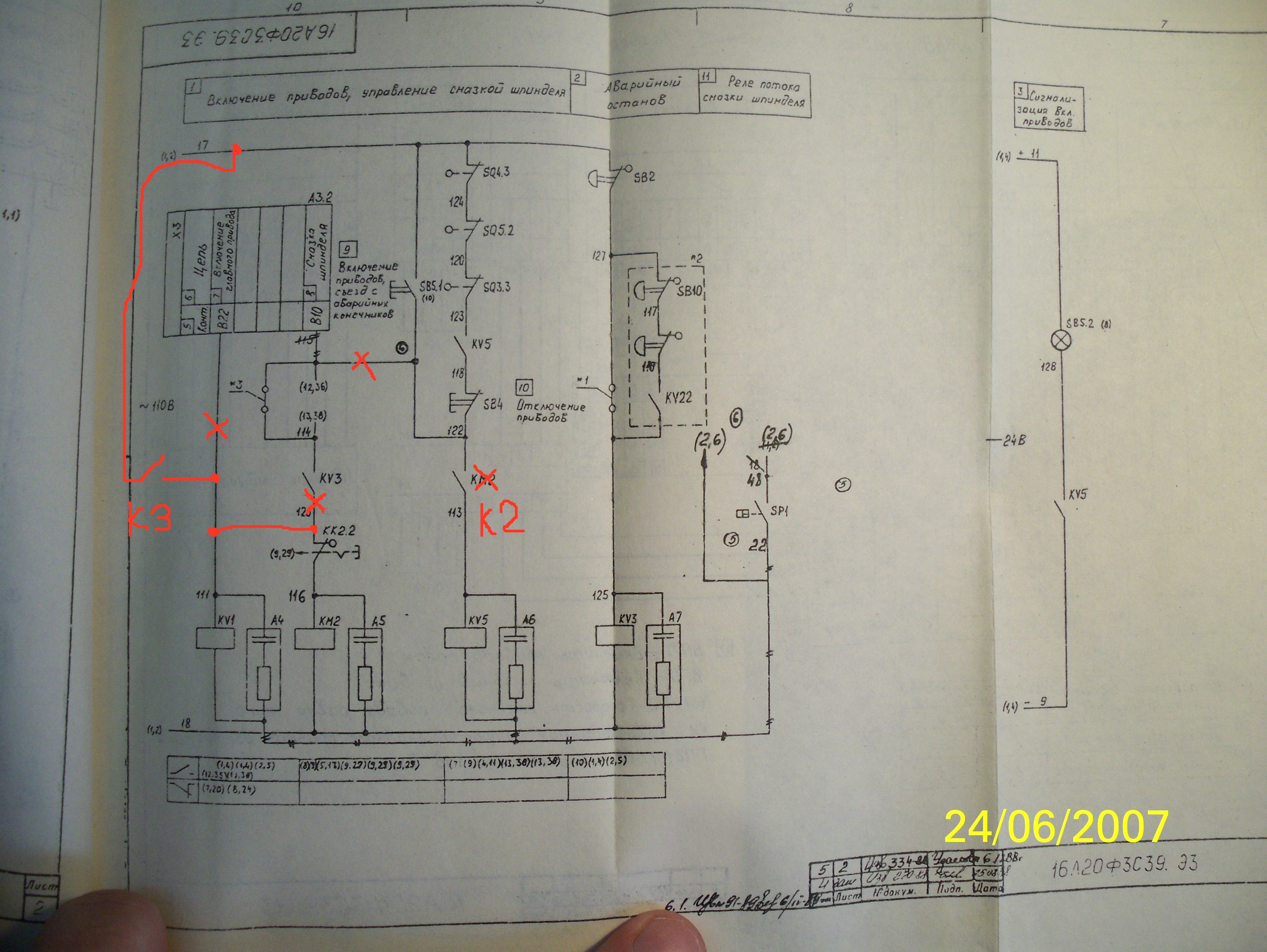 Далее долго коптился над схемами)я не особо уверенно их читаю. Но из консультации Владимира Т00Т, уяснил что надо сначала включить сигнал привода ОперативноеУправление Приводом,замкнув его на -15в, а это происходит когда смыкается пускатель КМ2, а он смыкается когда включается смазка шпинделя, для этого реле пускатель КМ2 перемычкой подключился к 110в, а далее подтянуть к -15В сигналы ВключениеПриводовПодач и ВключениеГлавногоПривода. Сегодня я сделал это проволочками) привода засвистели. Шпиндель закрутился сразу, а привода подач надо ещё кнопку нажать включения привода на панели оператора.