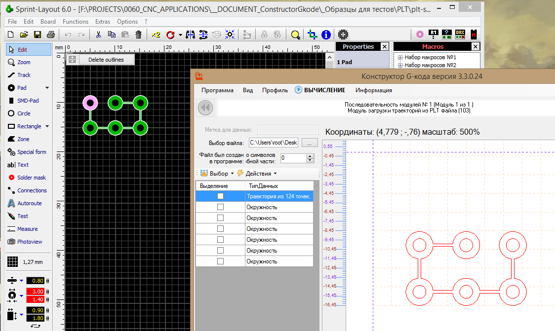 Сергей, подскажите (работаю в спринлаоут) почему при экспорте в plt расширение и gerber файла контура одно платы при создании г-кода конструктором получаю разные координаты. Это видно из КОМПАСА, в котором была нарисована сама плата. Гербер получается точнее, а в plt отверстия в плате съезжают относительно дорожек. Это может быть из-за того, что г-код дорожек делаю из гербера, а контур платы из экспорта в plt?