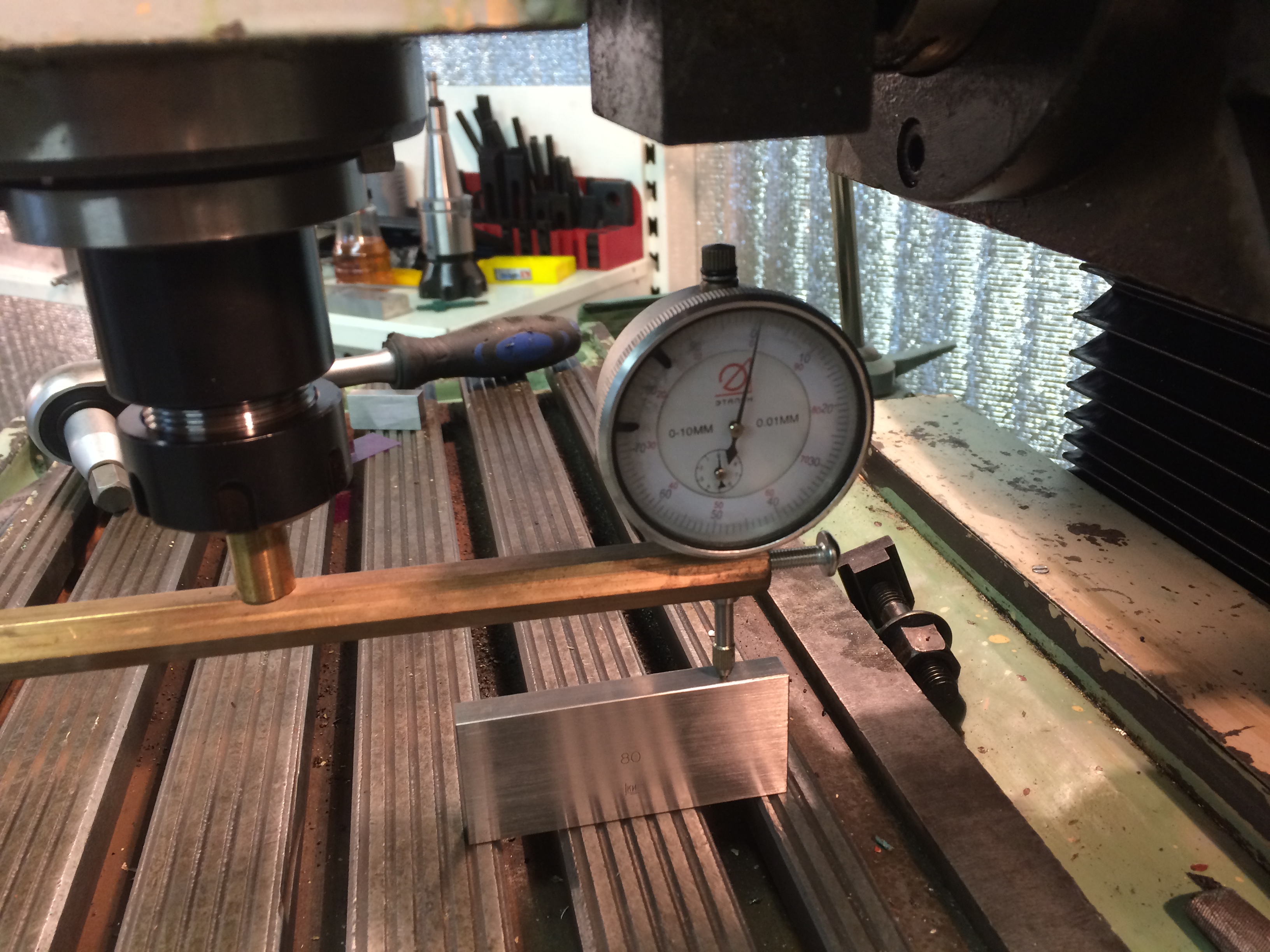Далее прогнал плоскость торцевой фрезой диаметром 80мм, в результате напахал канав видимые глазу и слегка ощутимых на ноготь...... наспех сделанная "балеринка " с плечом 100 мм показала отклонение вертикальности шпинделя относительно стола . В плоскости Х Z поправить вертикальность не составило труда, а вот плоскость У Z взятию нахрапом не поддалась , завтра буду снимать ВФГ, для поглядеть на случайно попавший мусор ,ну или калиброванные прокладки буду вставлять между ВФГ и балкой............
