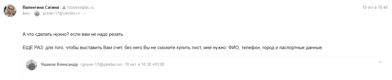 Чтобы узнать РЕАЛЬНУЮ цену (ибо без выставления счёта, как оказалось, цены в переписке были сильно занижены, что не соответствует действительности) за лист (без пиления, упаковки, доставки и прочих плюшек) у меня в трех, в трёх, Карл! :eh: