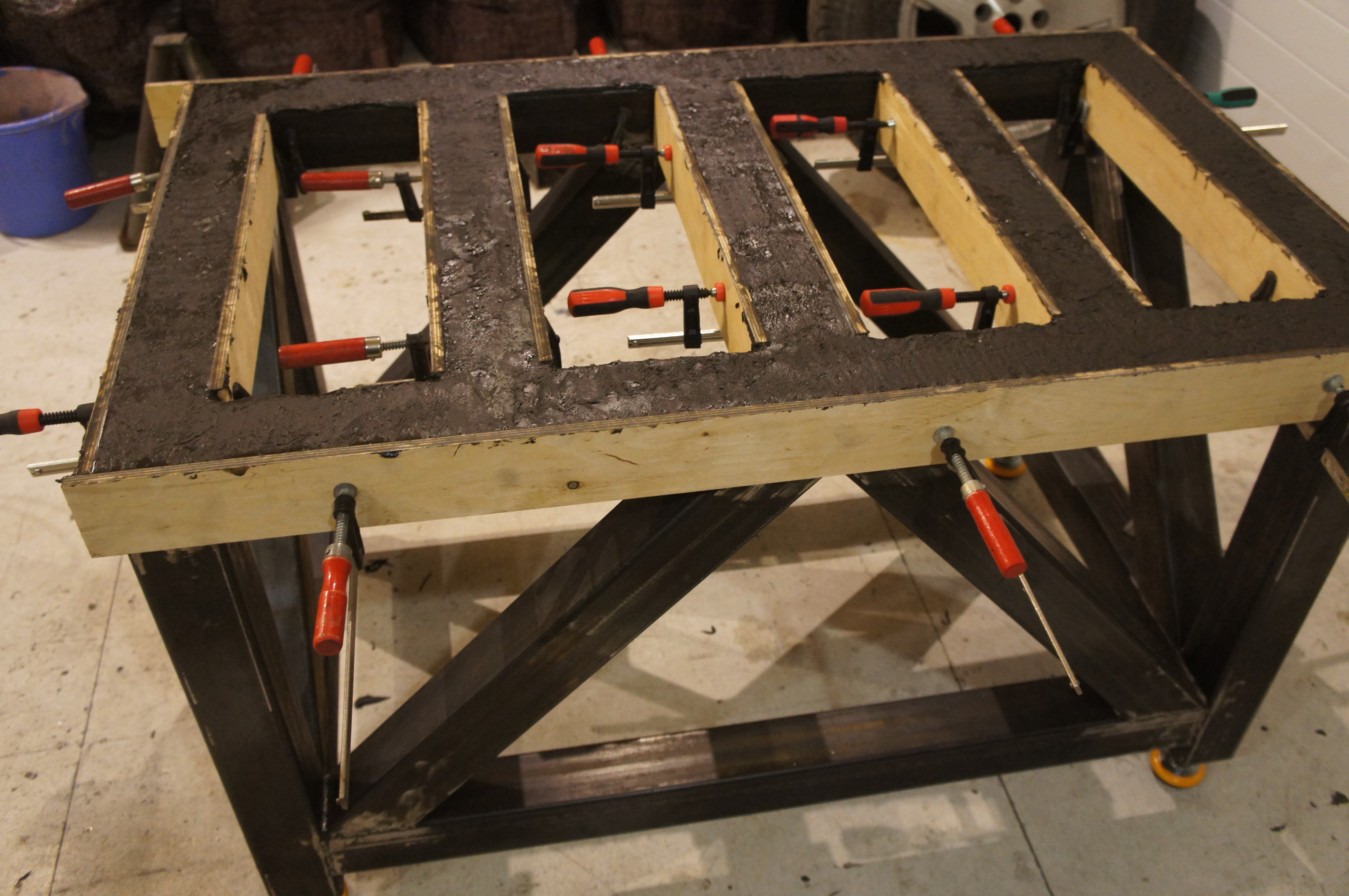 В этот раз нарезал на большом роутере полос из 12 мм фанеры, выставил их на раме в виде эдакой опалубки по хорошему строительному уровню 0,5 мм/м, зафиксировал струбцинами.