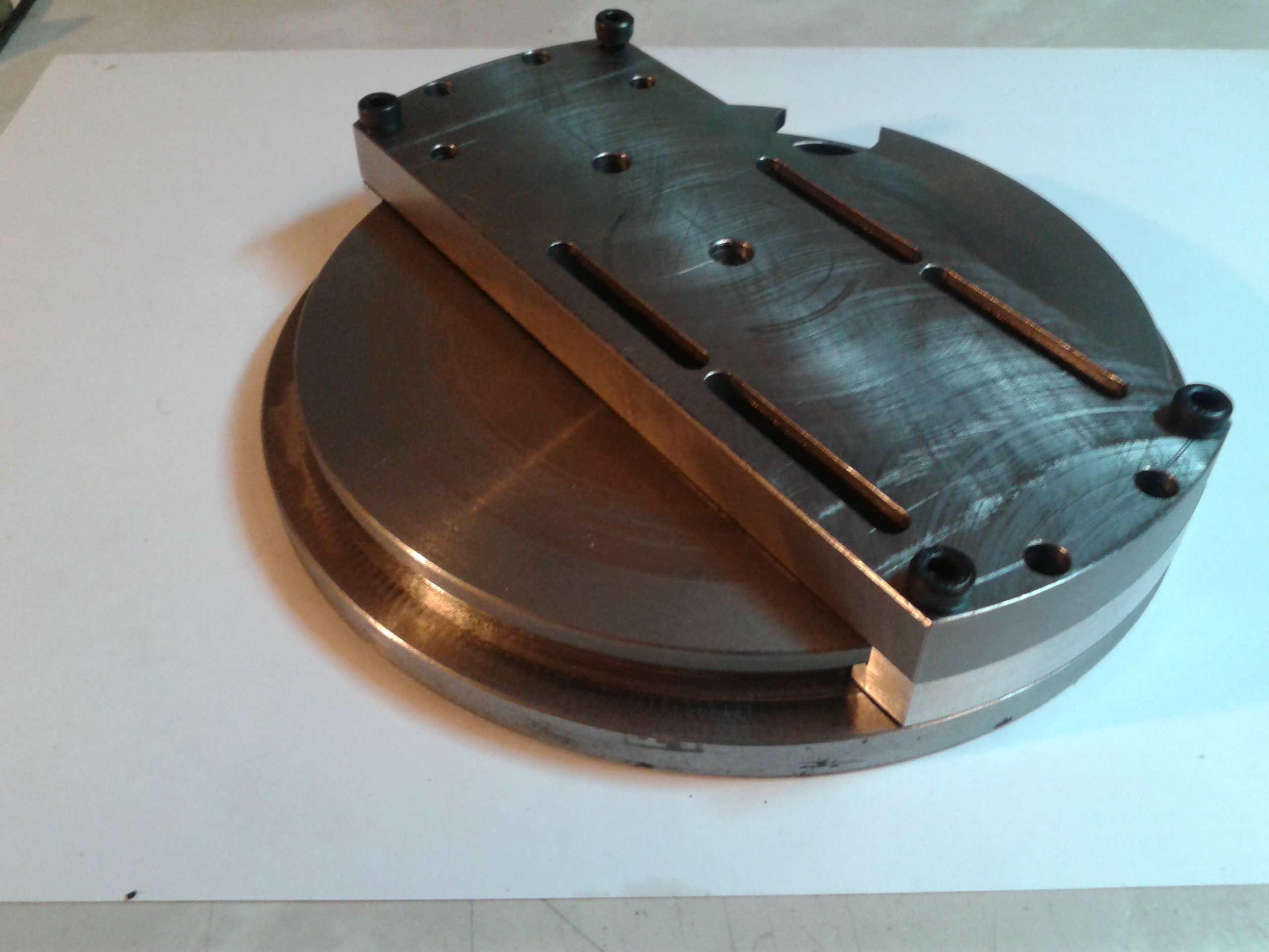 Нашел блинчик под переднюю бабку ,обточил под прижимы и получаем возможность крутить бабку на большой угол,т.к. сам стол лишь в несколько градусов регулироваться будет.
