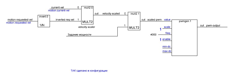 однако в цепи управления мощностью, есть еще регулятор, который управляется отношением motion.current-vel/motion.requested-vel то есть снижает мощность в момент разгона-торможения.