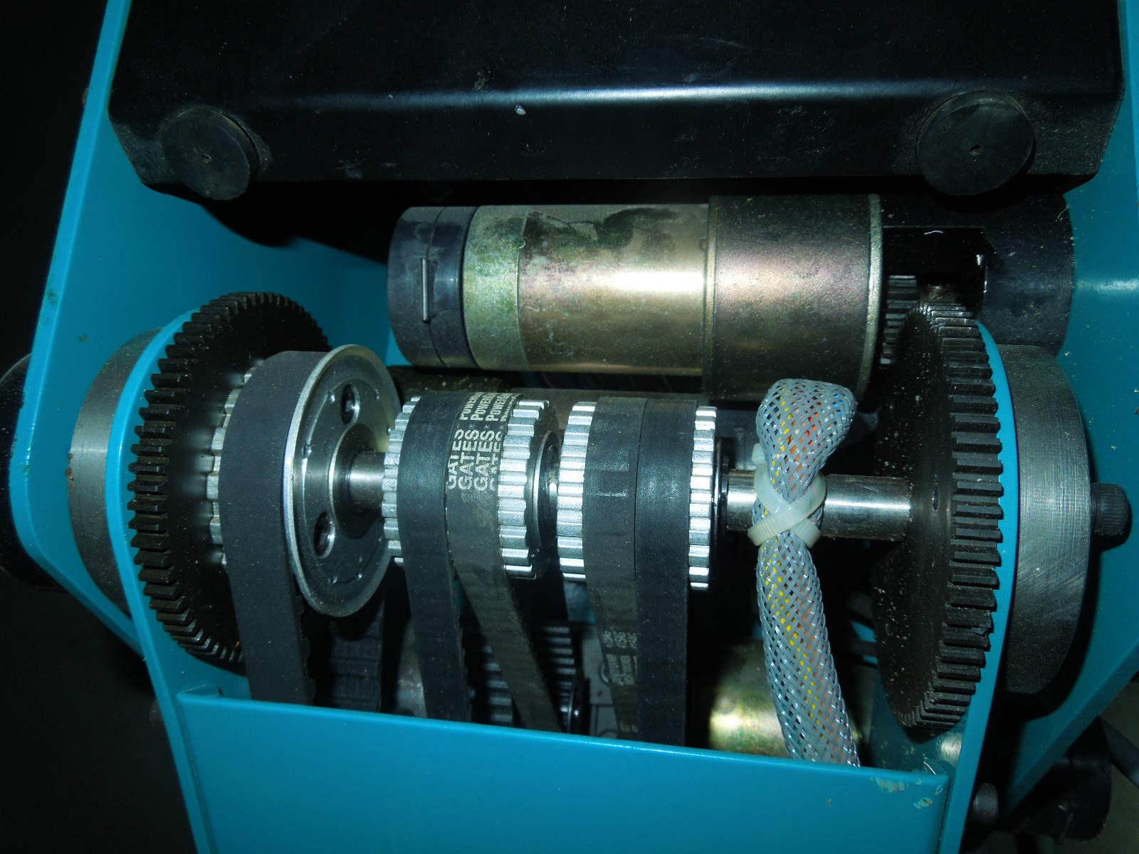 т.е. Центральный мотор крутит вал. Далее на этот вал "надет" вал- типа "трубка" вращение на который передаёт соседний мотор ч/з ремень. Третий мотор также вращает ещё один вал - трубку. Т.е. Получаем 3 соосных вала.