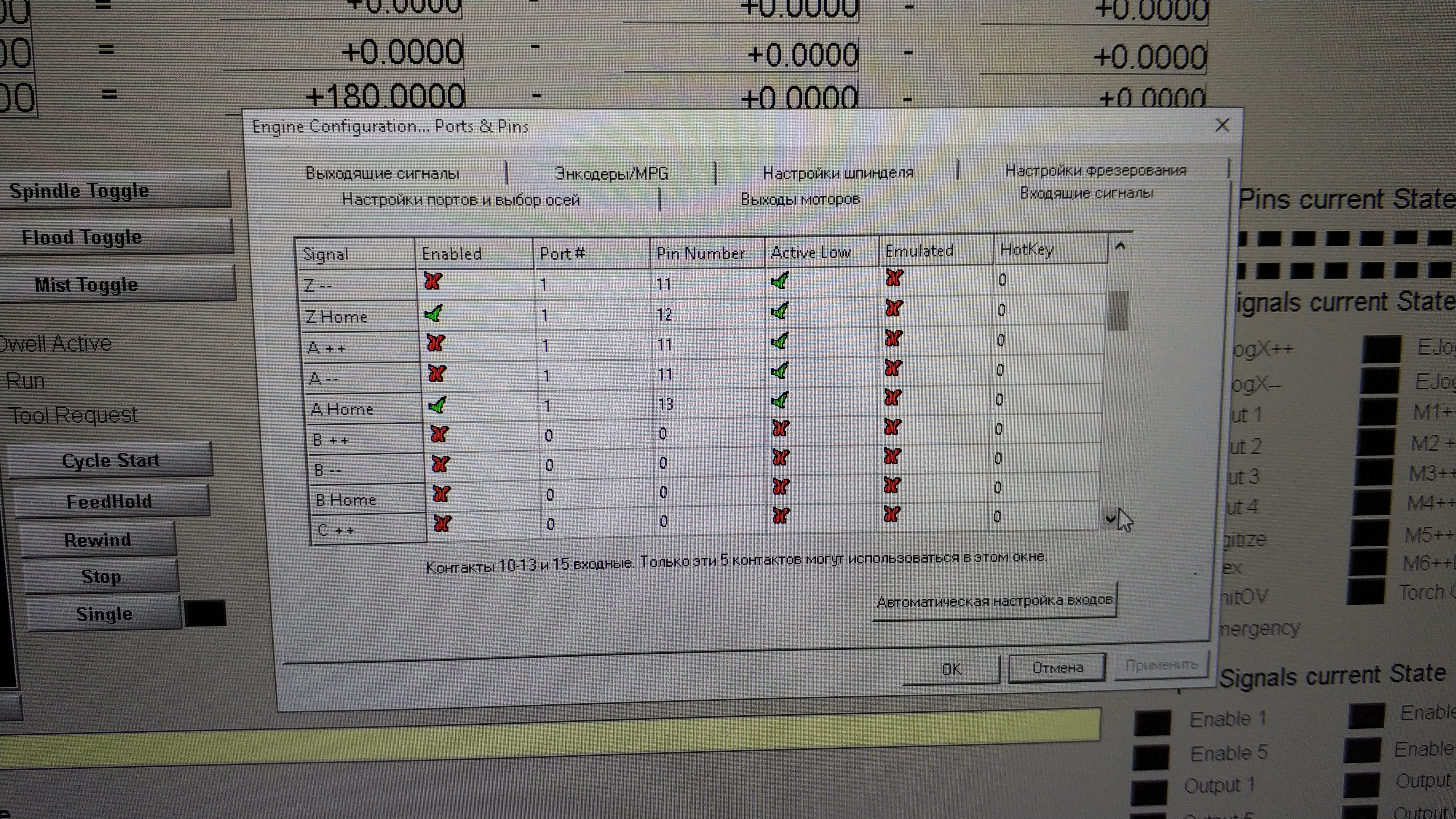 Сегодня, ближе к вечеру, доберусь до станка и настроек, все сфоткаю и скину сюда.FLUKE писал(а):На сколько помню концевик для А должен присутствовать и назначен как Home. В окне диагностики, при нажатии на A Home срабатывает? На М4?