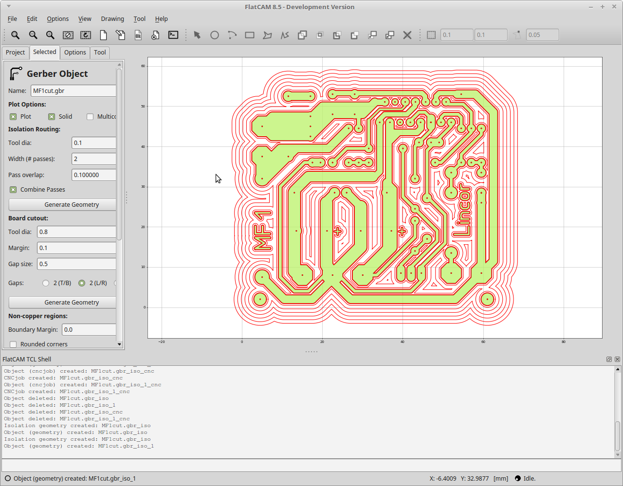 Примерно всё тоже самое в Flatcam, при выборе нового инструмента старую тракторию не проходит. Вопрос с компенсацией остался открытым.
