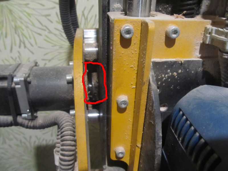 У моего станочка появился люфт на оси примерно до 0,5мм. Не понимаю как его убрать. Гайка на валу находится глубоко за фрезером. Слева приварена заглушка(на фото выделил красным).