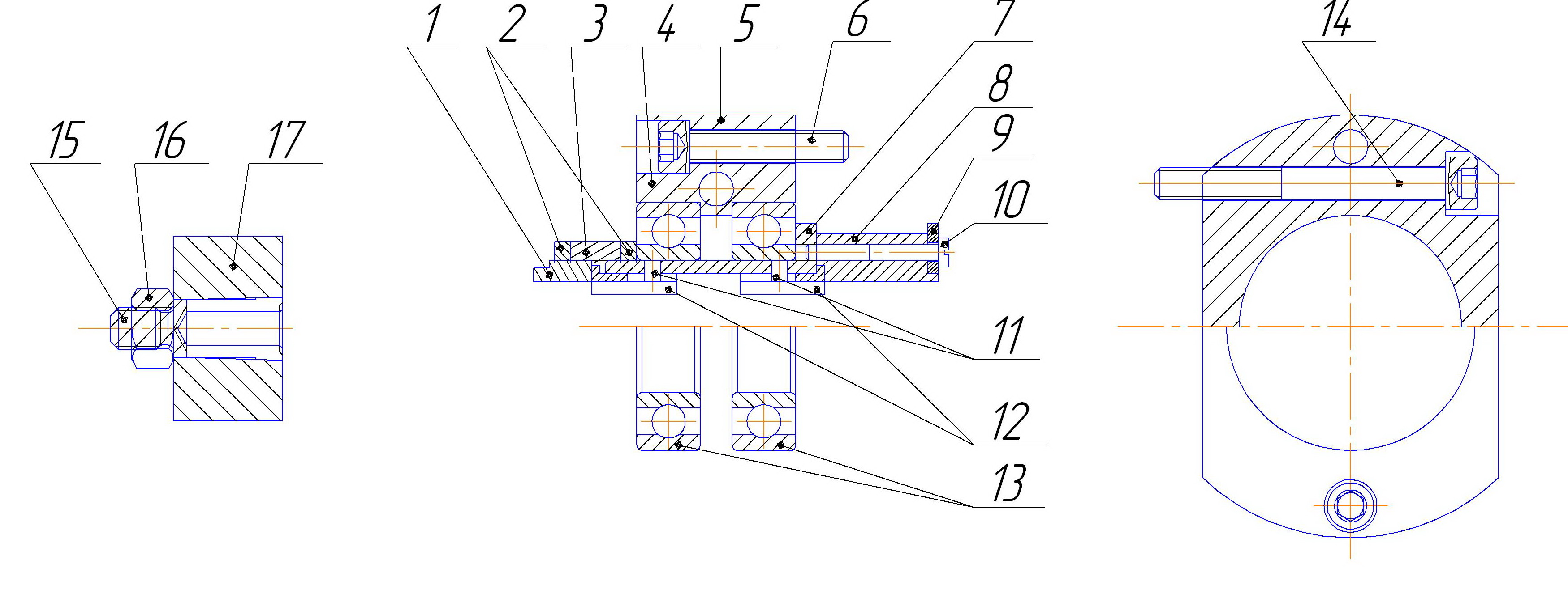 Вращающаяся гайка состоит из корпуса поз.5, в котором установлена пара подшипников 80105 размером 25х47х12мм. Крепление корпуса к конструкции станка происходит при помощи двух винтов М6 поз.6 или поз.14 в зависимости от способа крепления. На внутренние кольца подшипников базируется ось поз.7. Зазор между обоймами подшипников выбирается закручивая правую гайку поз.2 на ось поз.7, далее производится фиксация положения гайки 3 относительно оси гайкой поз.2 по резьбе М25х1.