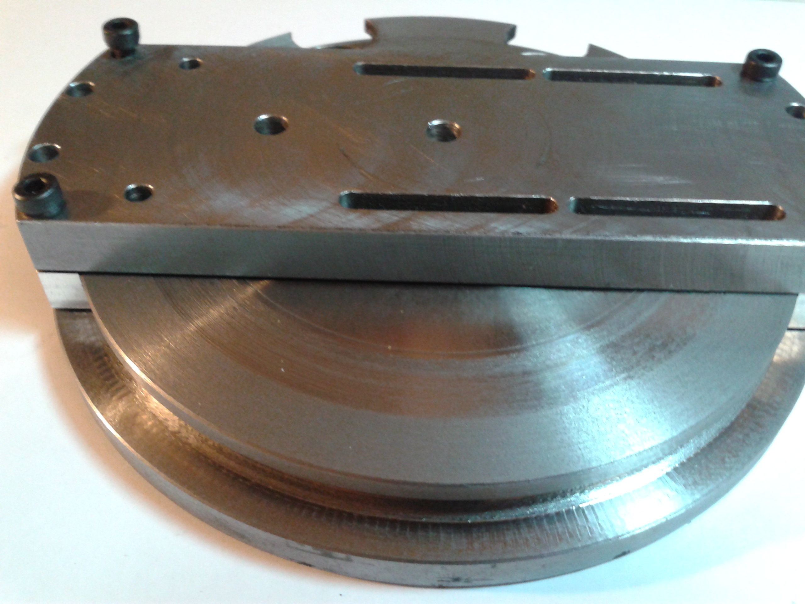 Нашел блинчик под переднюю бабку ,обточил под прижимы и получаем возможность крутить бабку на большой угол,т.к. сам стол лишь в несколько градусов регулироваться будет.