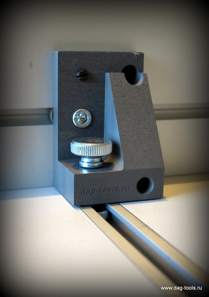 Специальные угловые креплении для бокового упора, разработанные нами для профиля - шина PR TR100-08. Имеет микрометрические регулировки. Что облегчает подстройку бокового упора на 90 градусов относительно фрезерного стола.