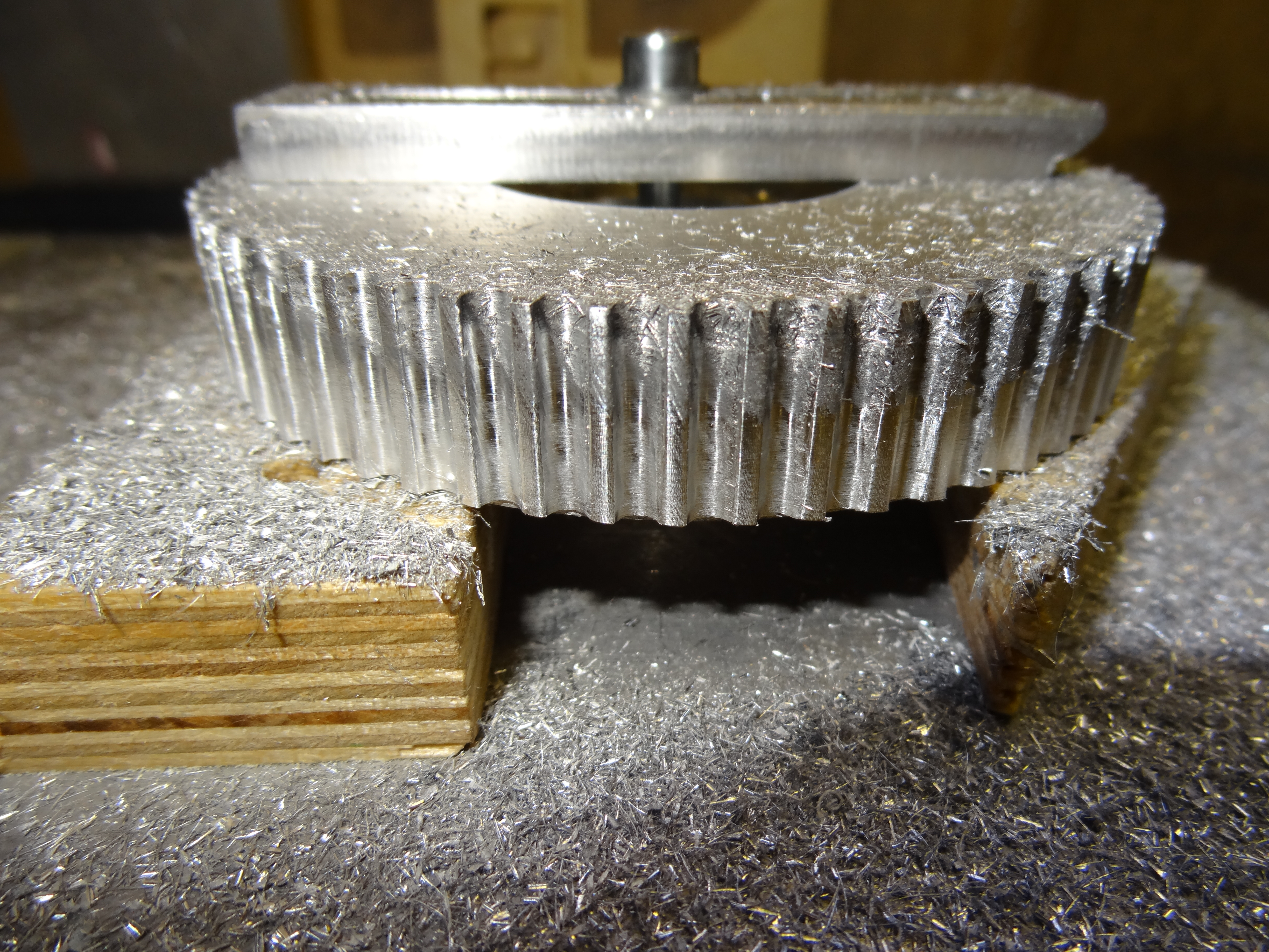 Мелкую фрезу отгибает, поэтому сложно попасть в размер. Но если пилить вертикально (плунжерное фрезерование), тогда сразу хорошо снимает, и поверхность приличная выходит. Если предварительно дырки насверлить, то потом можно фрезой потолще по окружности отрезать. Шестерня была нужна для ремня HTD-5М, там по расчетам на 60 зубов длина окружности должна быть 300 мм, а по факту от силы 295.