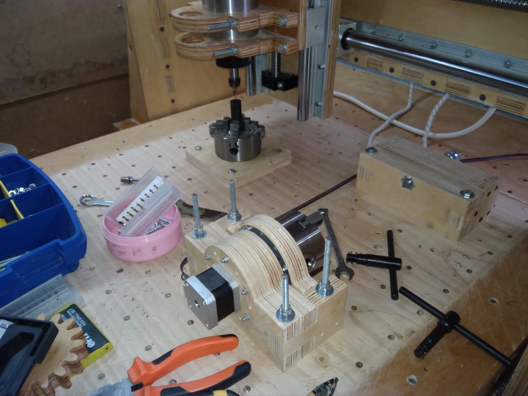 Вчера запустил поворотную ось к станку на мелкой гармошке 17х80 и 80мм патроне. Мотор пока мелкий, какой под рукой был: